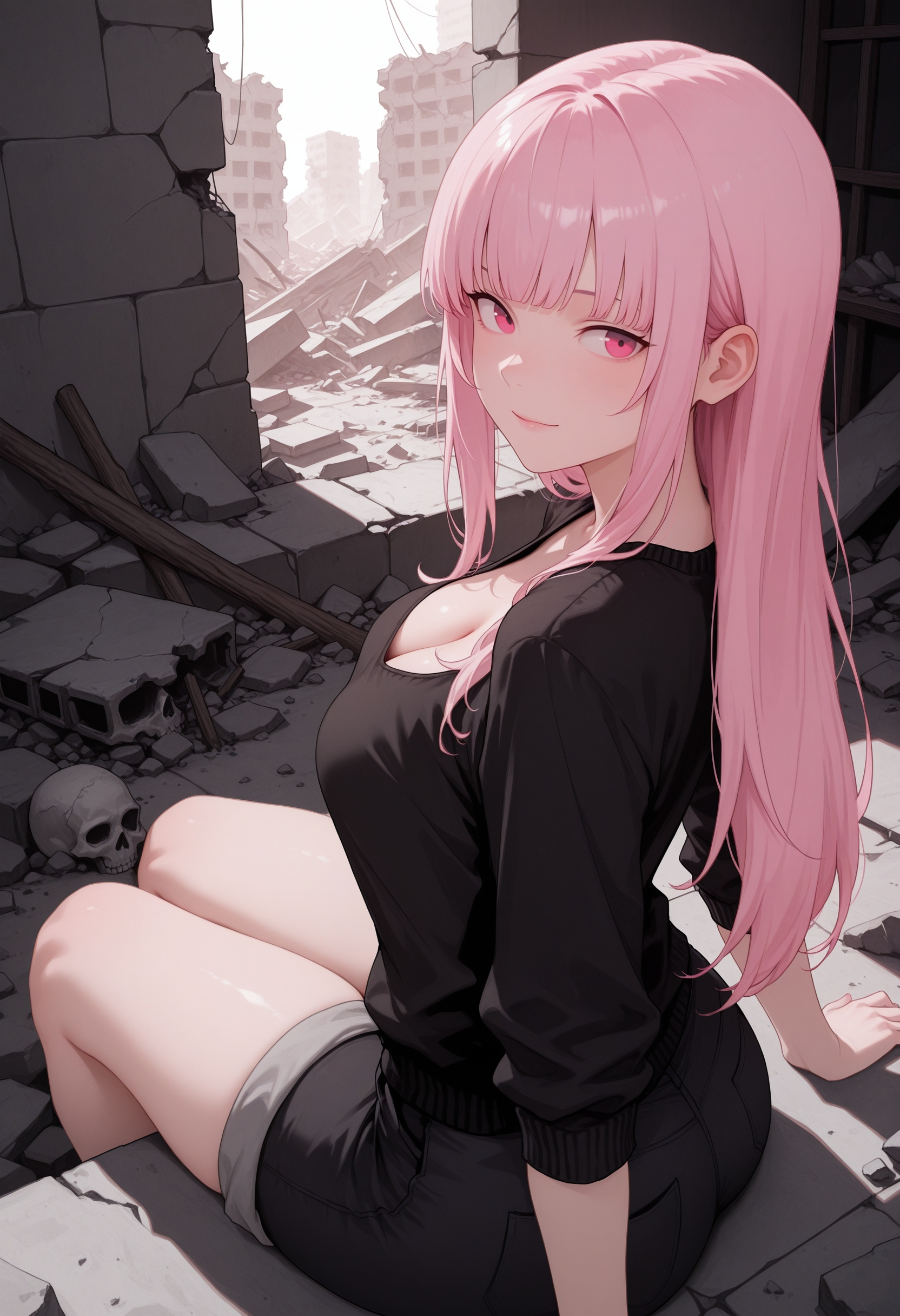 (긍정적 프롬프트) mori calliope, 분홍색 머리카락, 긴 머리카락, 측면 머리카락, 둔한 앞머리, 분홍색 눈,