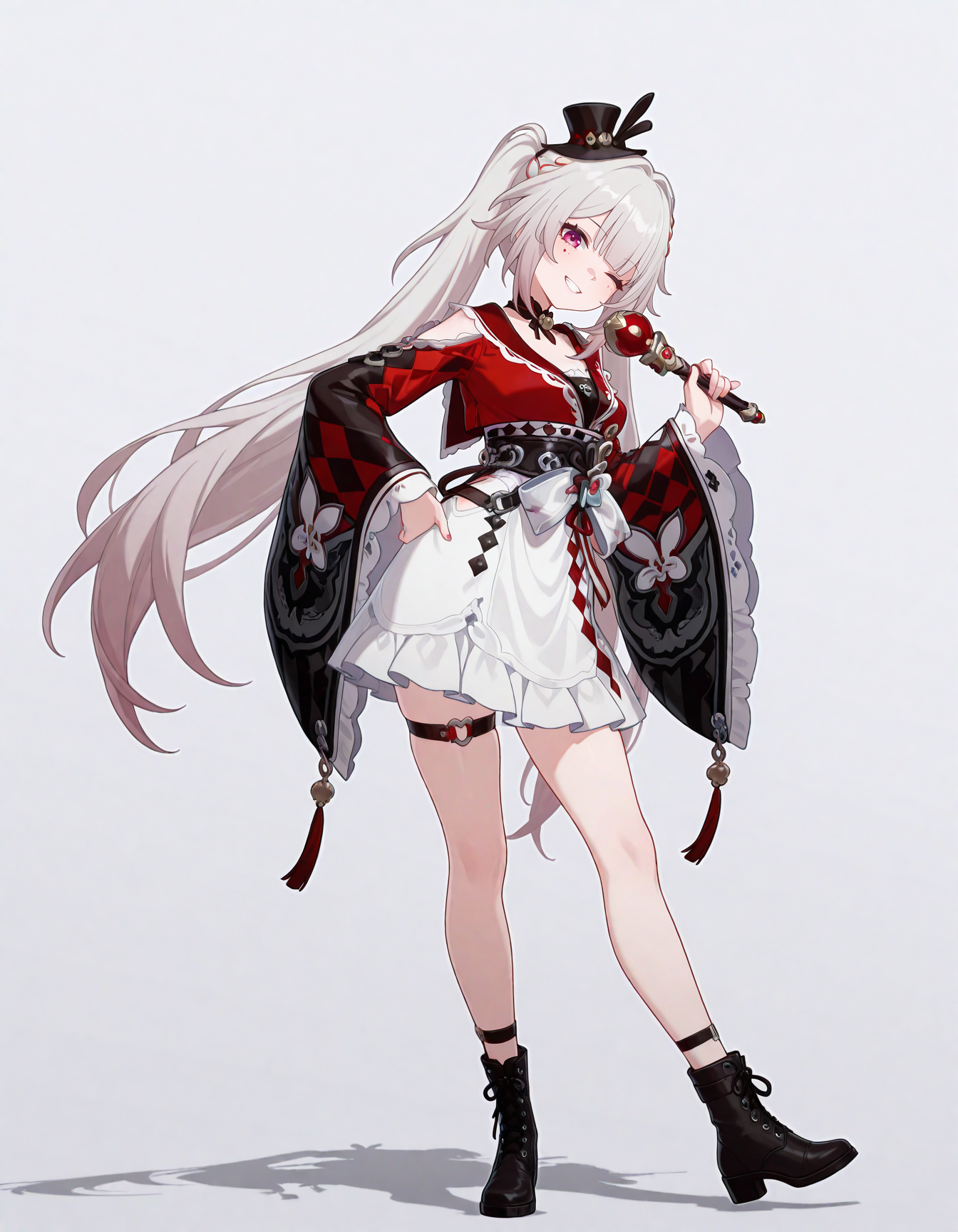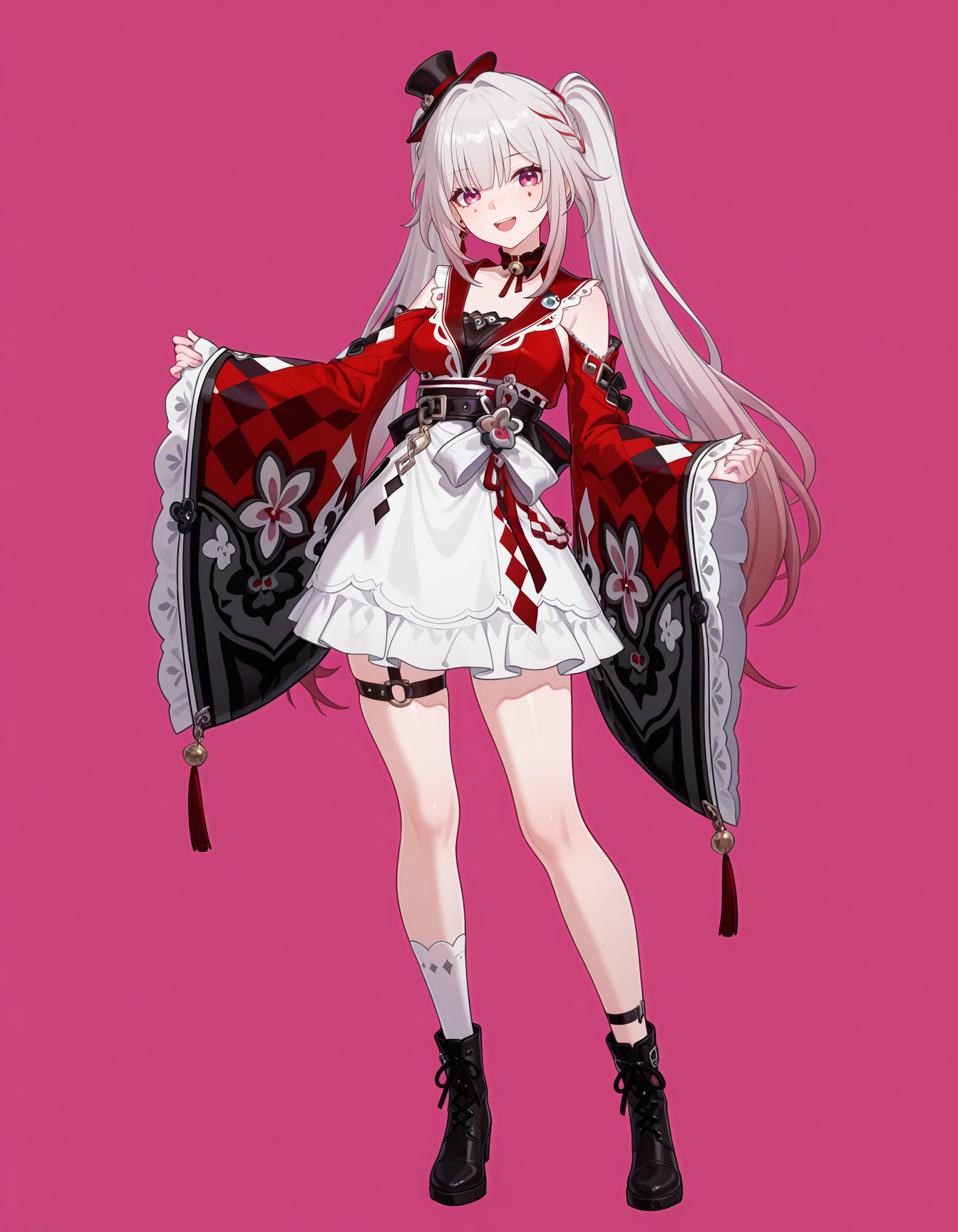 mai_sparxie_\(honkai_star_rail\),aged_up:1.5),long_hair,twintails,braid,grey_hair,multicolored_hair,red_hair,pink_eyes,facial_mark,virtual_youtuber,mini_top_hat,japanese_clothes,detached_sleeves,wide_sleeves,black_footwear,white_skirt,thigh_strap,single_sock,ankle_boots