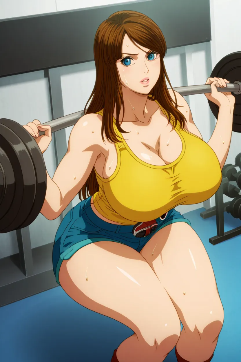 1girl, Yuriko Okada (Tojima Wants to Be a Kamen Rider), blue eyes, long hair, brown hair, lips, glossy lips, massive breasts, Tojima Wants to Be a Kamen Rider_art_style, HD, hi-res, no-flaws, superb quality