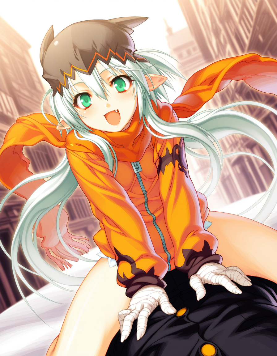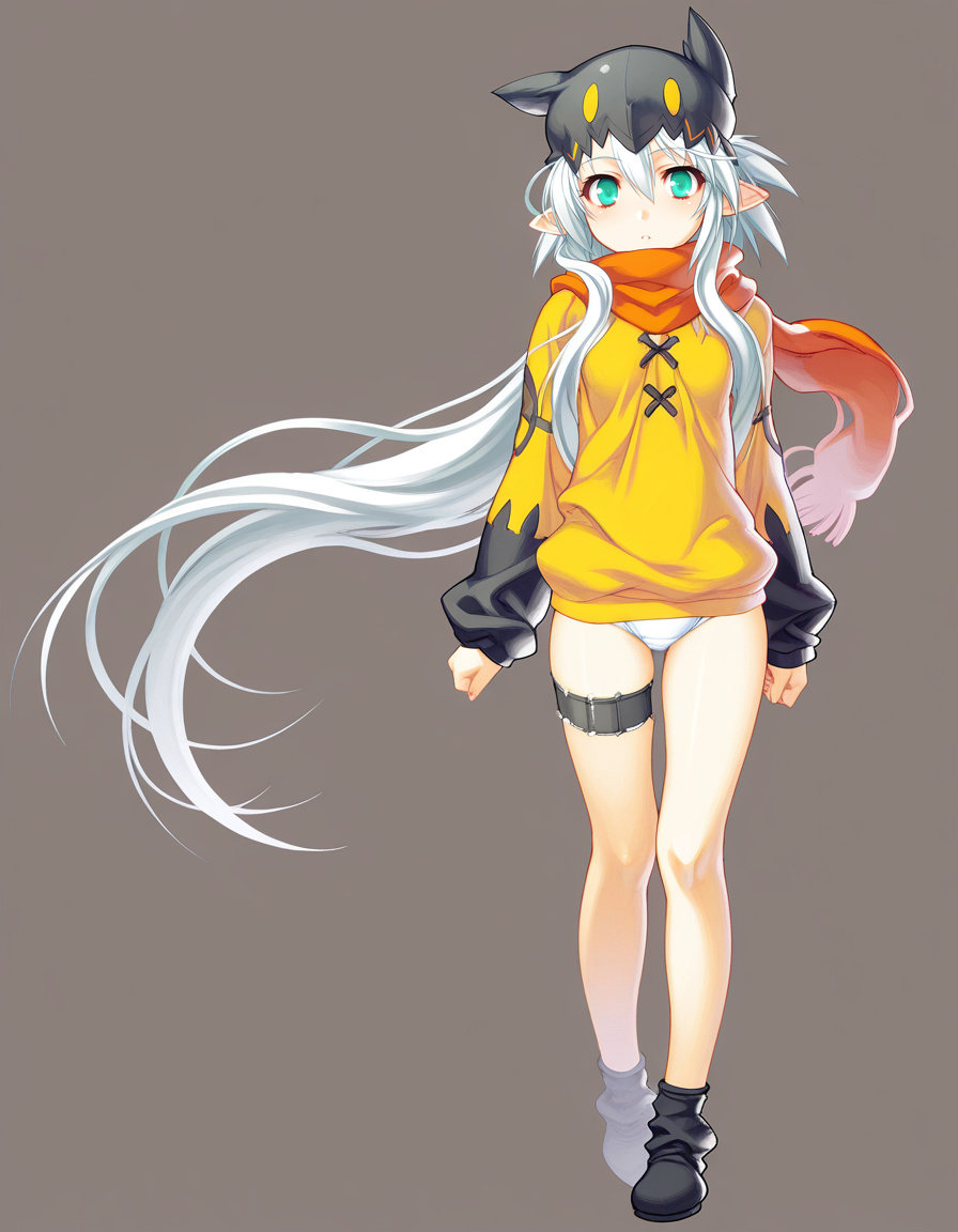 mai_jmyou,mai_kuwajm,game_cg,long_hair,white_hair,aqua_eyes,pointy_ears,animal_hat,scarf,thigh_strap,yellow_shirt