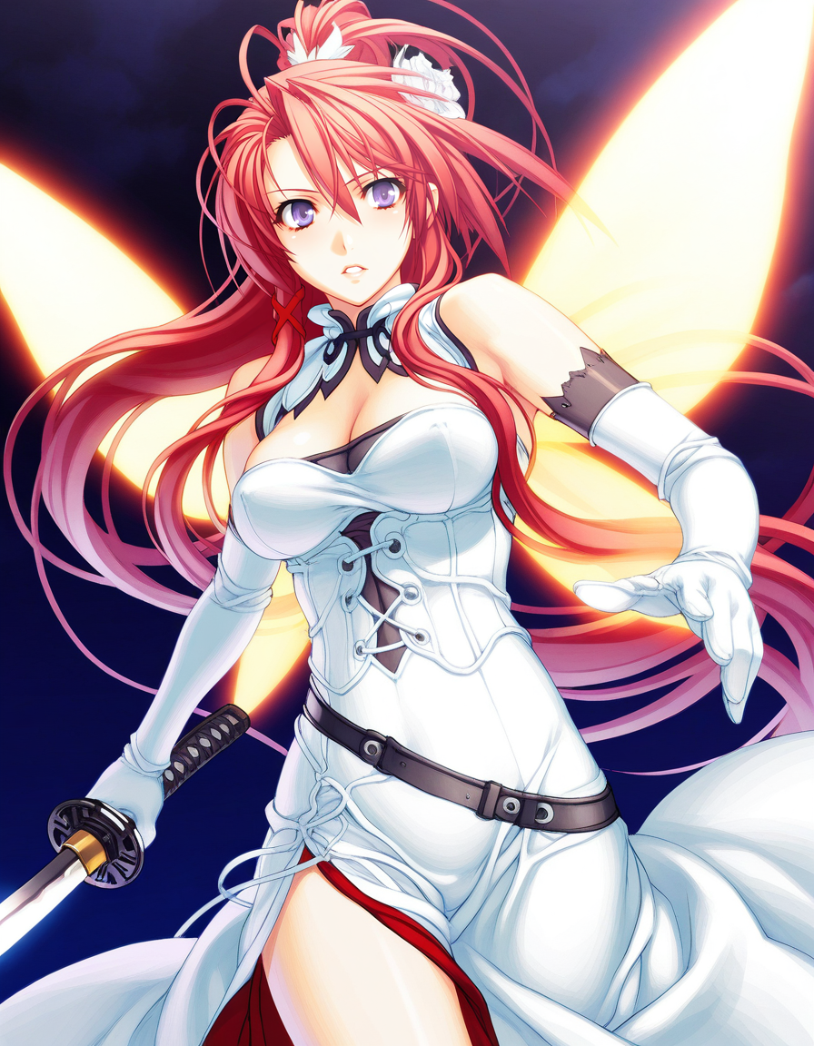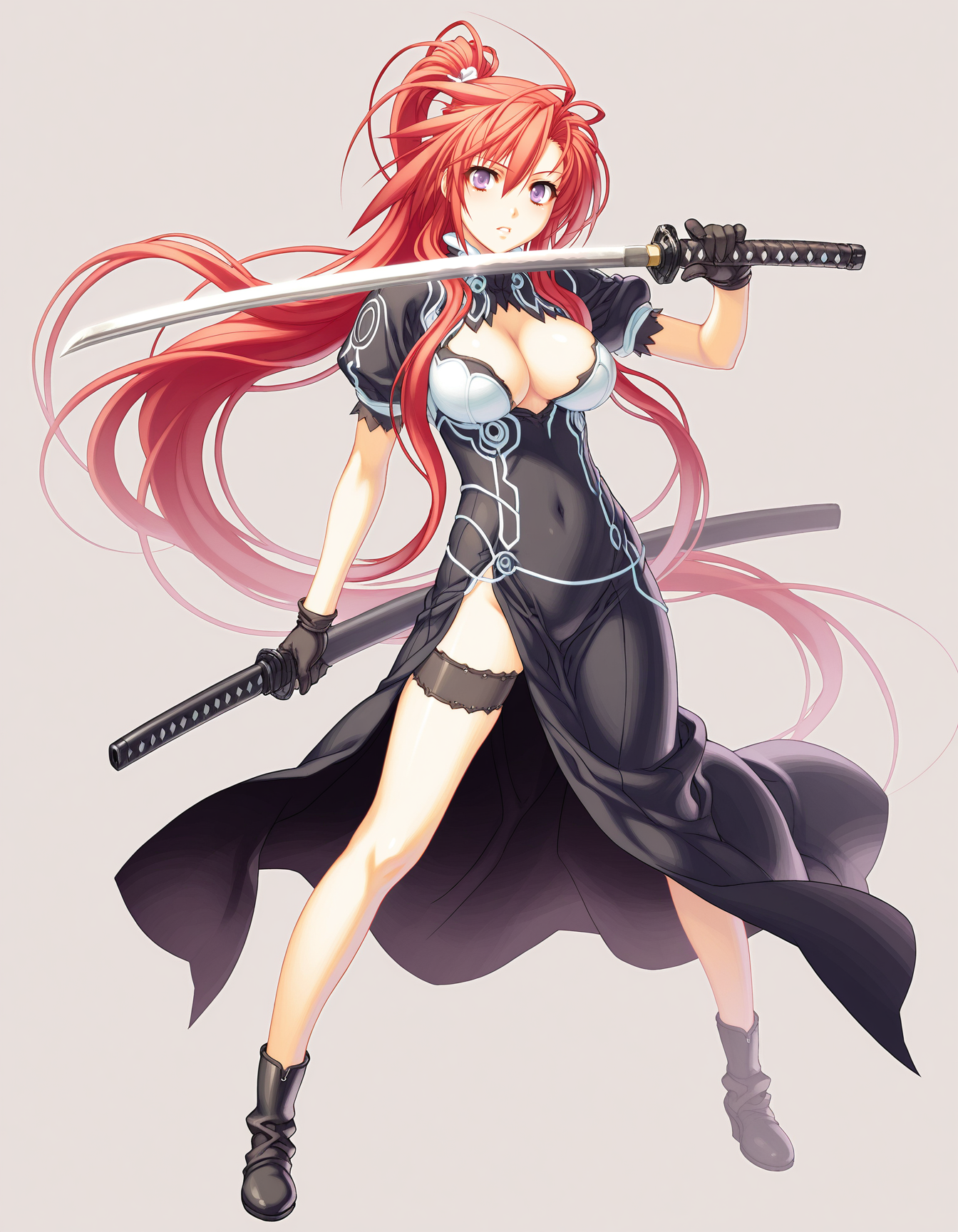 mai_jmyou,mai_Ignisjm,game_cg,very_long_hair,red_hair,purple_eyes,ponytail,large_breasts,black_dress,gloves,black_boots,holding_katana