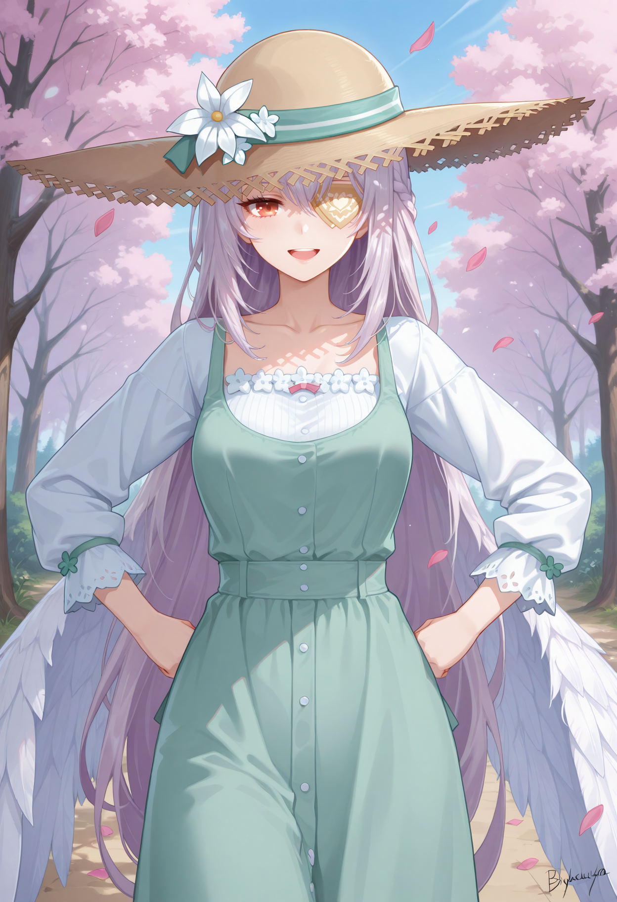 더 완벽하게 만들기 위해 더 많은 캐릭터 태그를 추가하세요: 1girl, long hair, bangs, red eyes, hat, ribbon, flower, white hair, petals, eyepatch, white flower, sun hat, straw hat, hat flower, long sleeves, dress, very long hair, collarbone, wings, braid, sandals, feathered wings, green dress, white wings, straw hat, multiple wings,