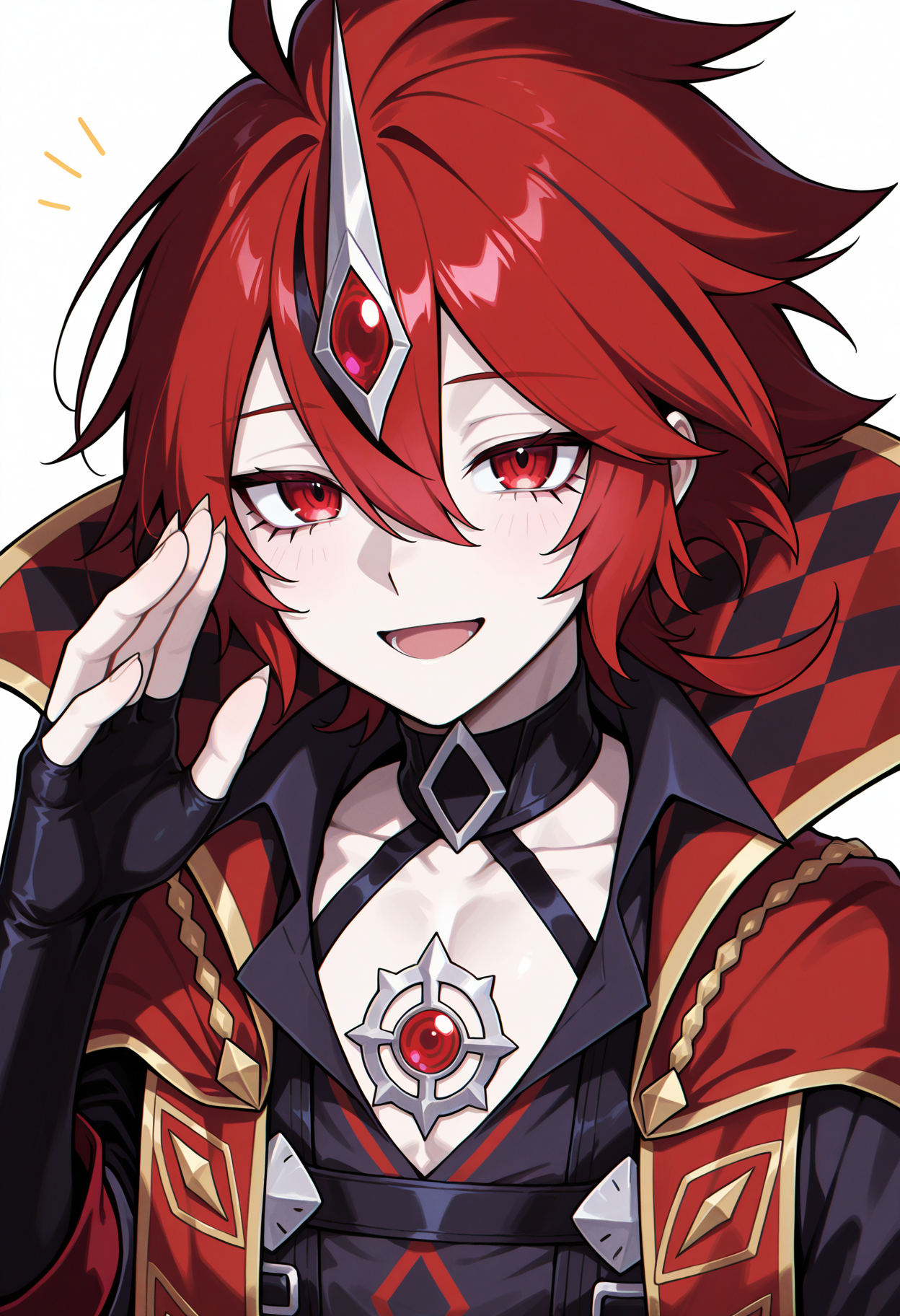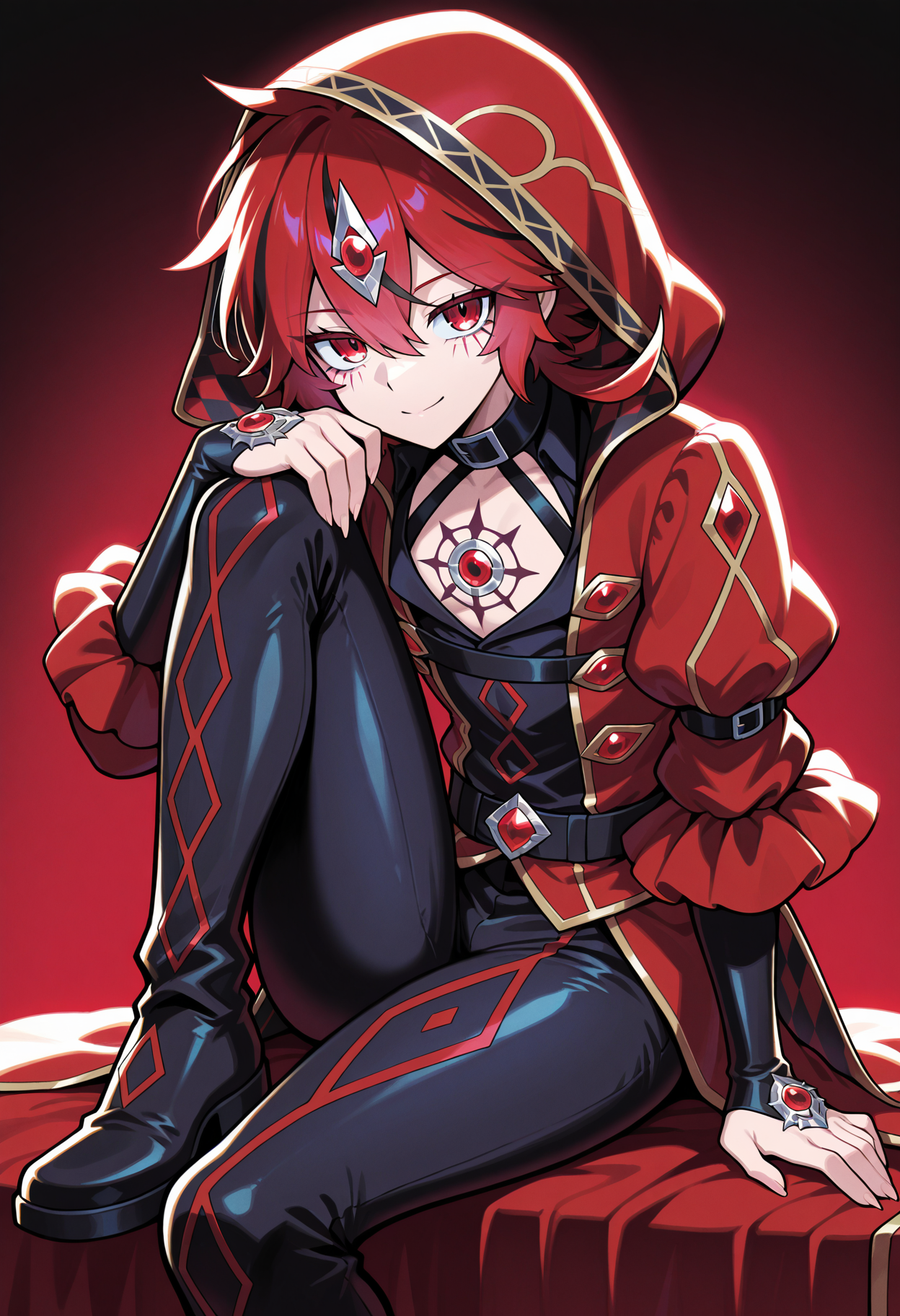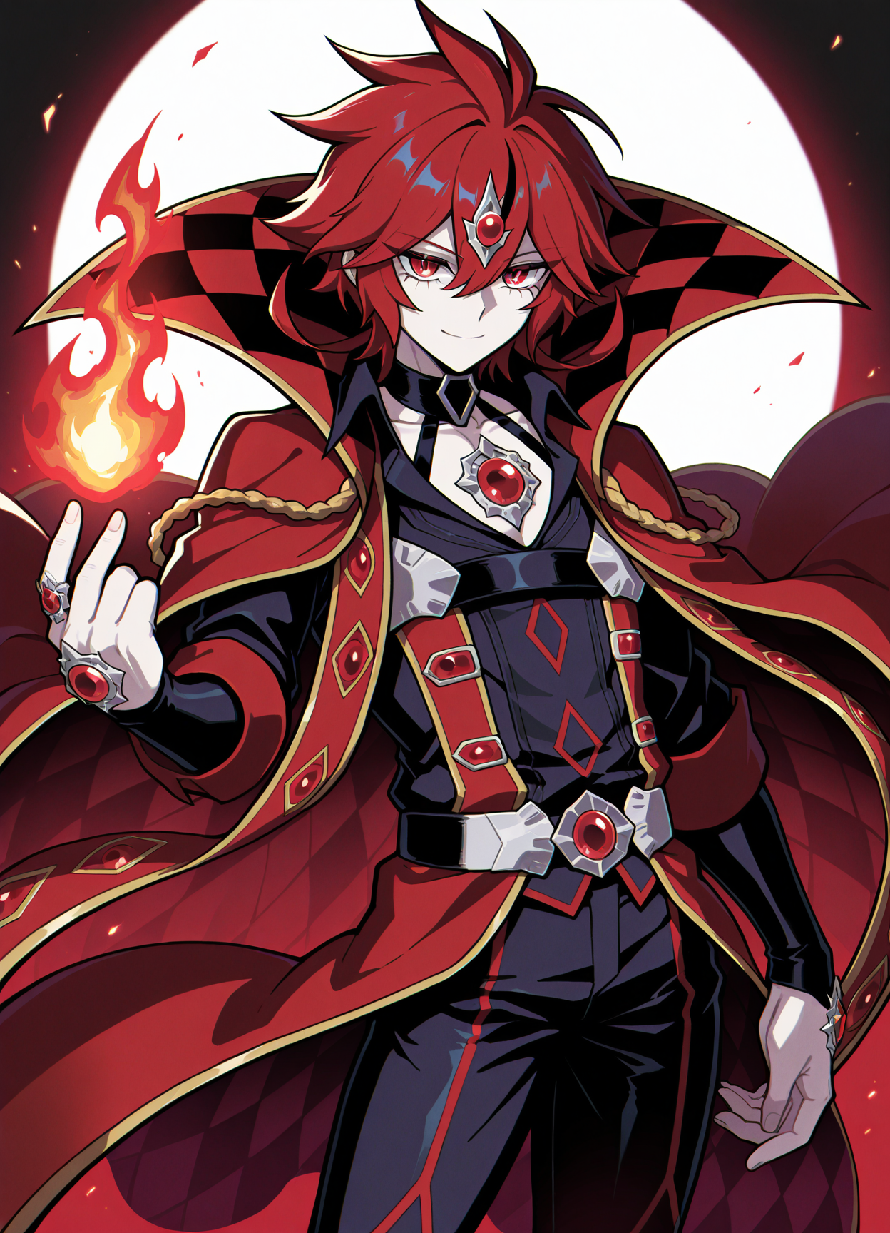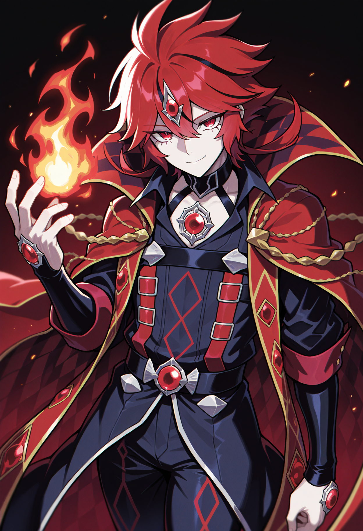 タグ(衣装): 赤いマント、エギュイレット、高めのカラー、黒いジャケット、黒いズボン