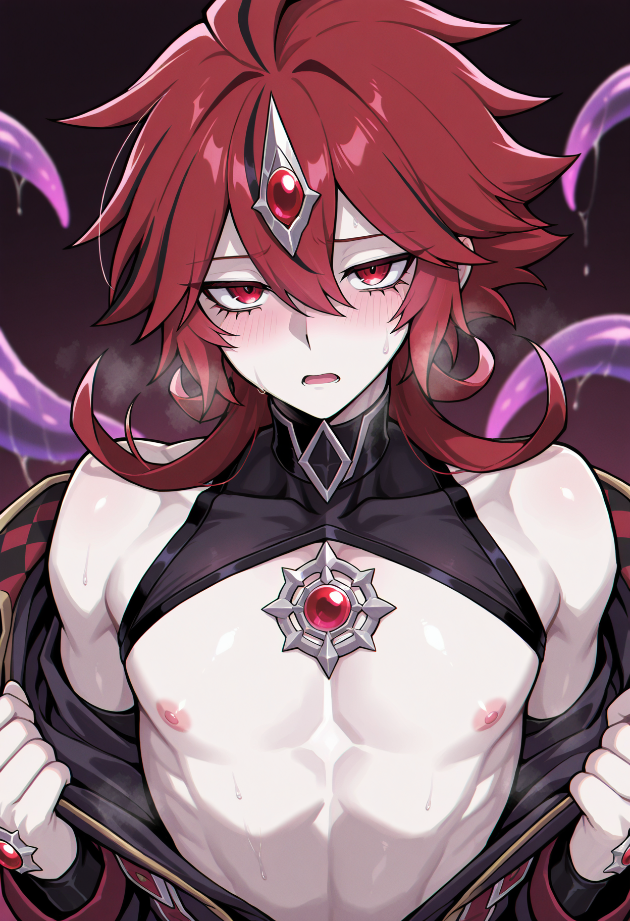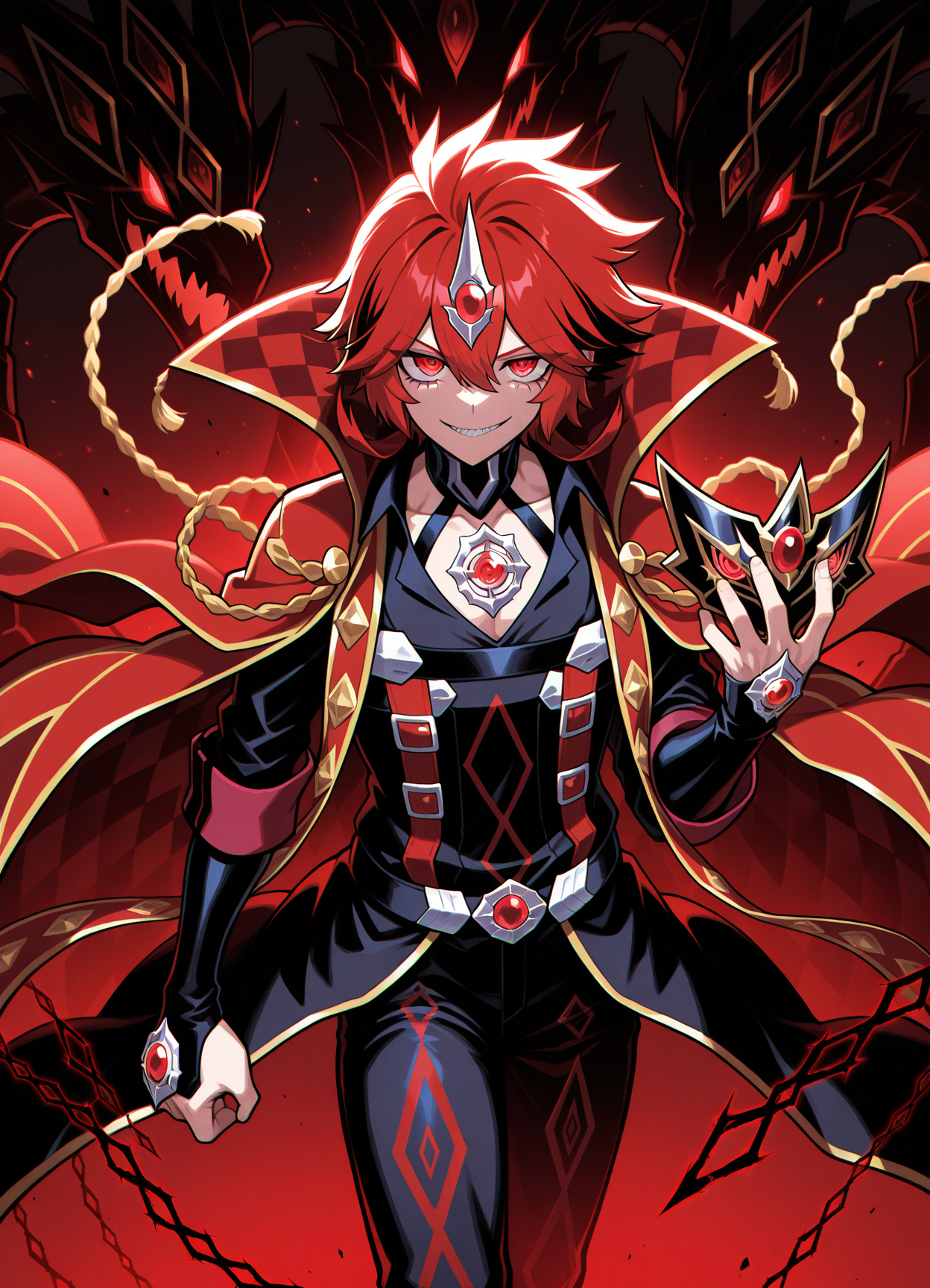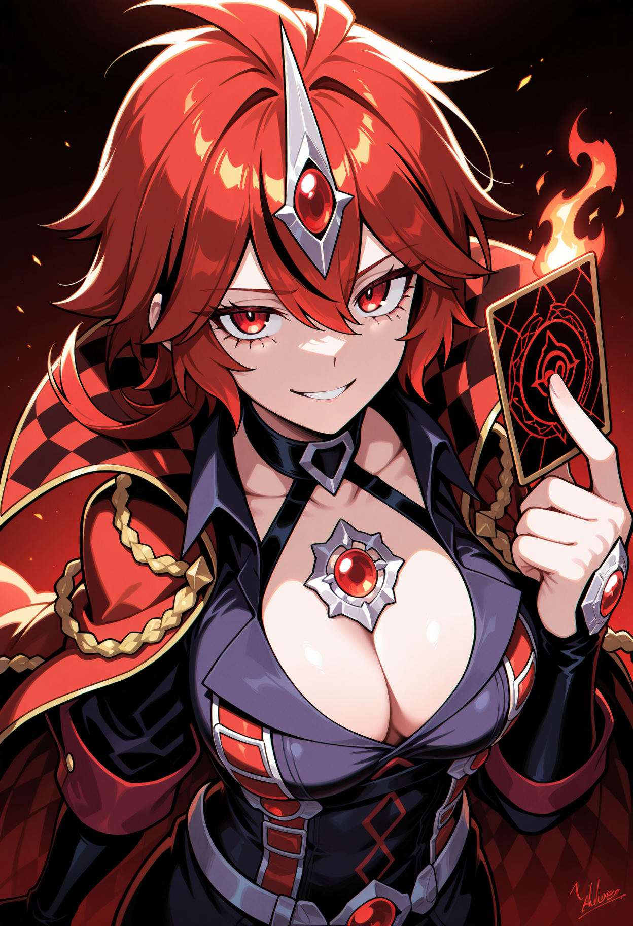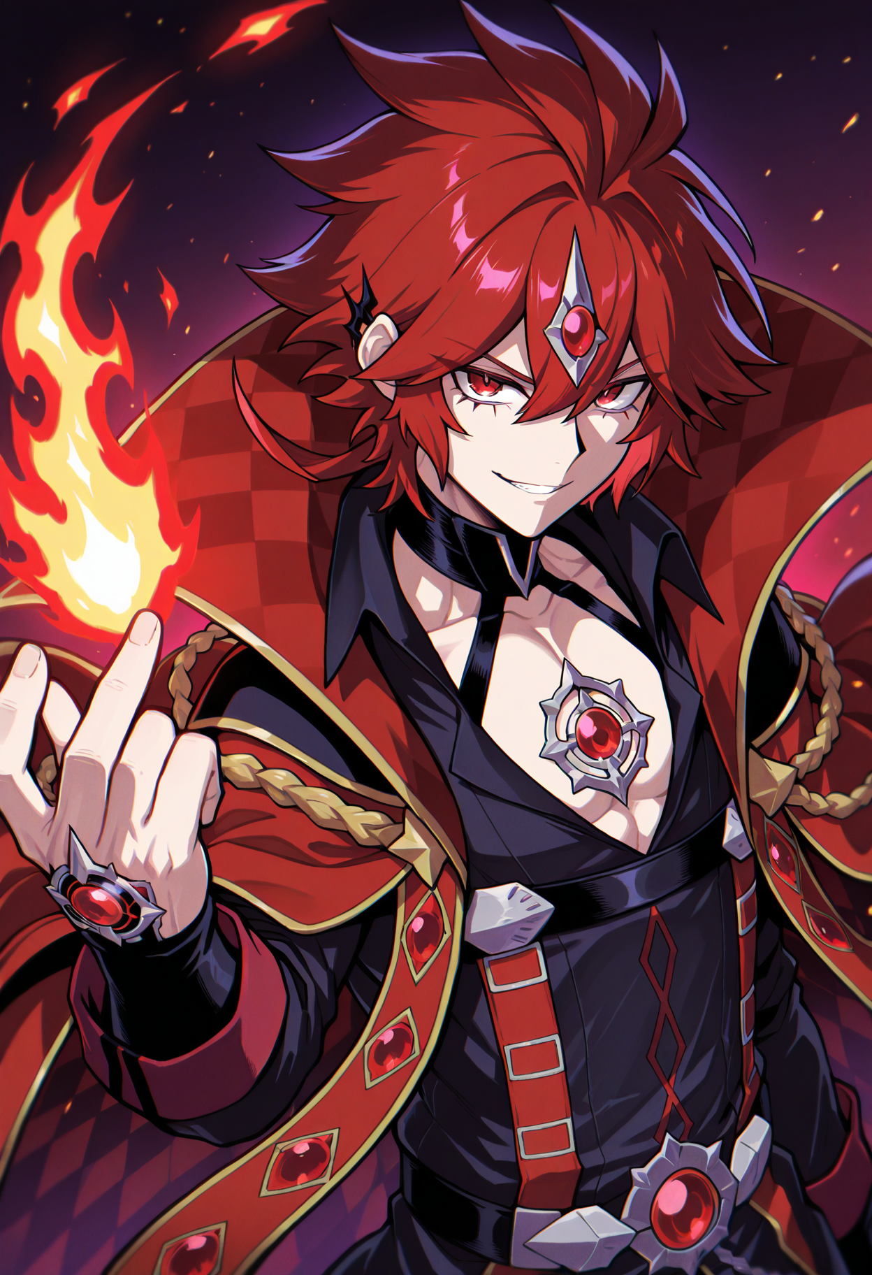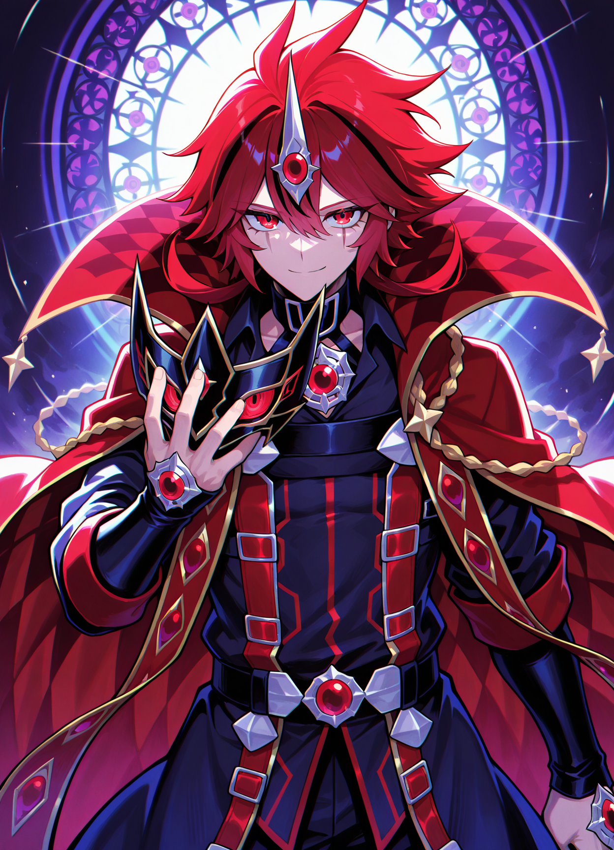タグ(衣装): 赤いマント、エギュイレット、高めのカラー、黒いジャケット、黒いズボン