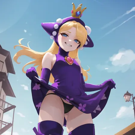 추가 트리거/태그: 보라색 드레스, 보라색 머리 장식, 보라색 팔장갑, 무릎 부츠, 왕관, 금발 머리, 파란 눈, 미소