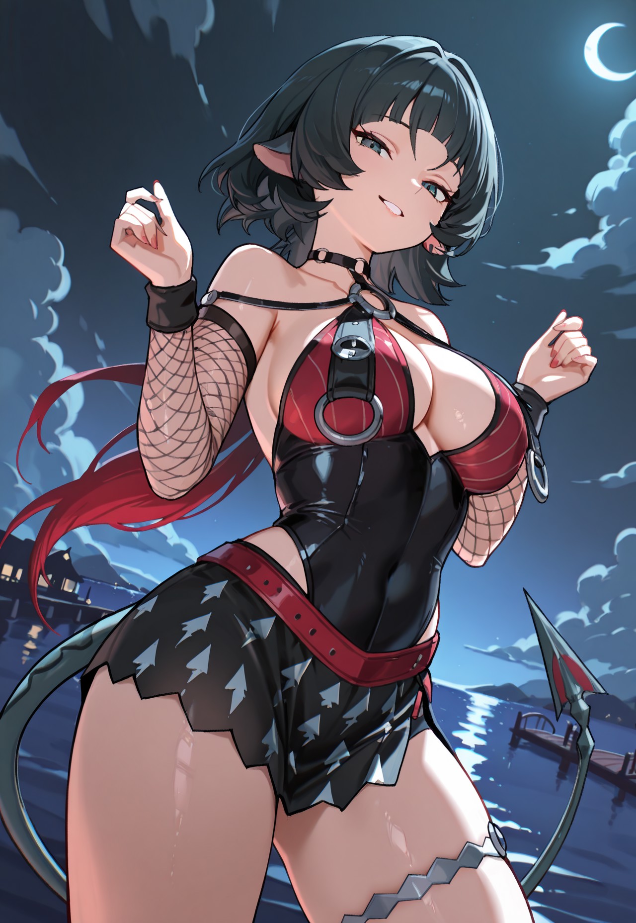 ,o-ring choker,fishnet sleeves,detached sleeves,o-ring breast curtains,cleavage,red belt,black sarong,single thigh strap,sharp tail,