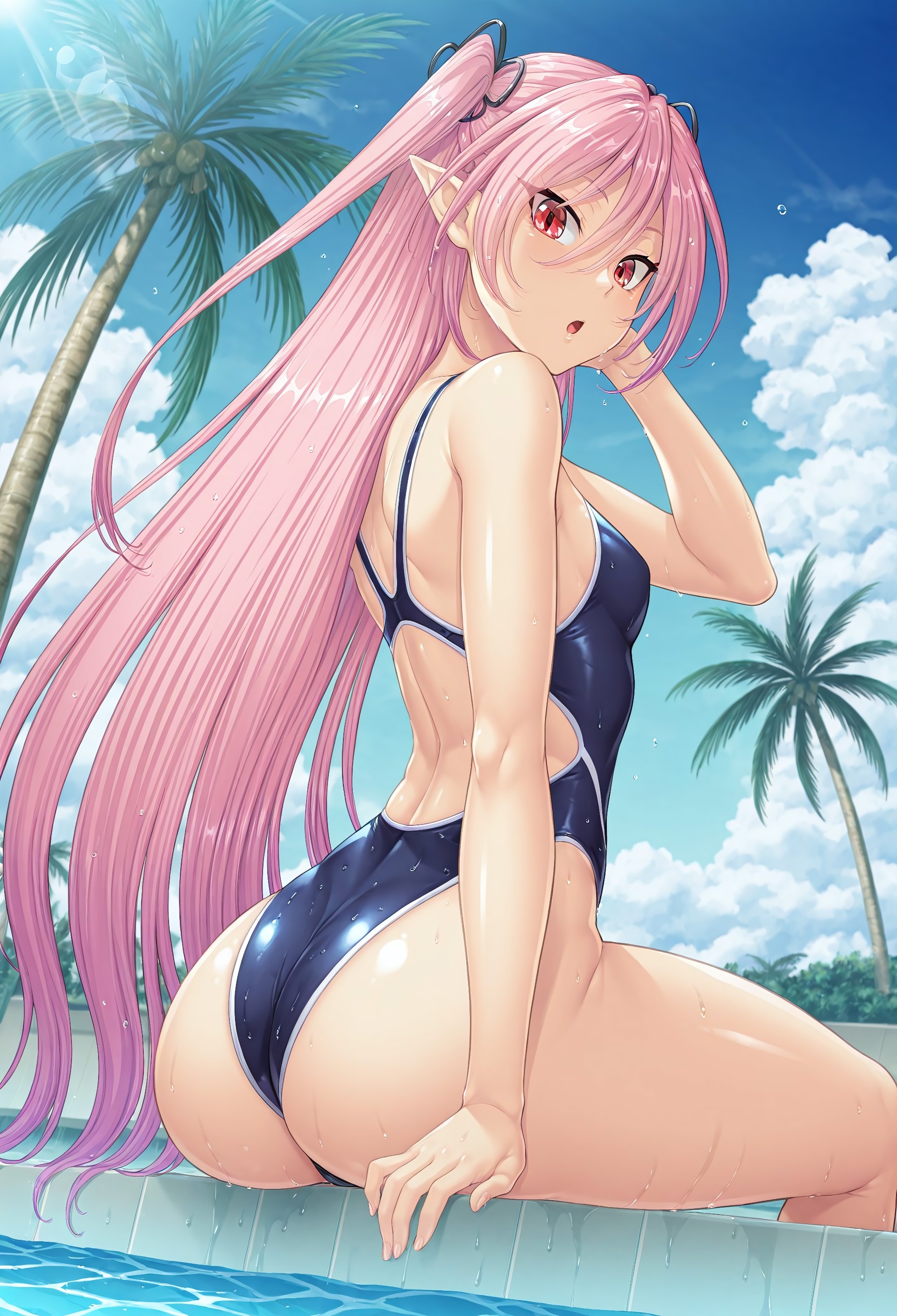 태그: 1girl, felicia (taimanin asagi), 매우 긴 머리, 분홍색 머리, 트윈테일, 양쪽 위로 올린 머리, 빨간 눈, tsurime, 뾰족한 귀, 작은 가슴, 반짝이는 피부, 손톱, 곡선형, 데몬 소녀,