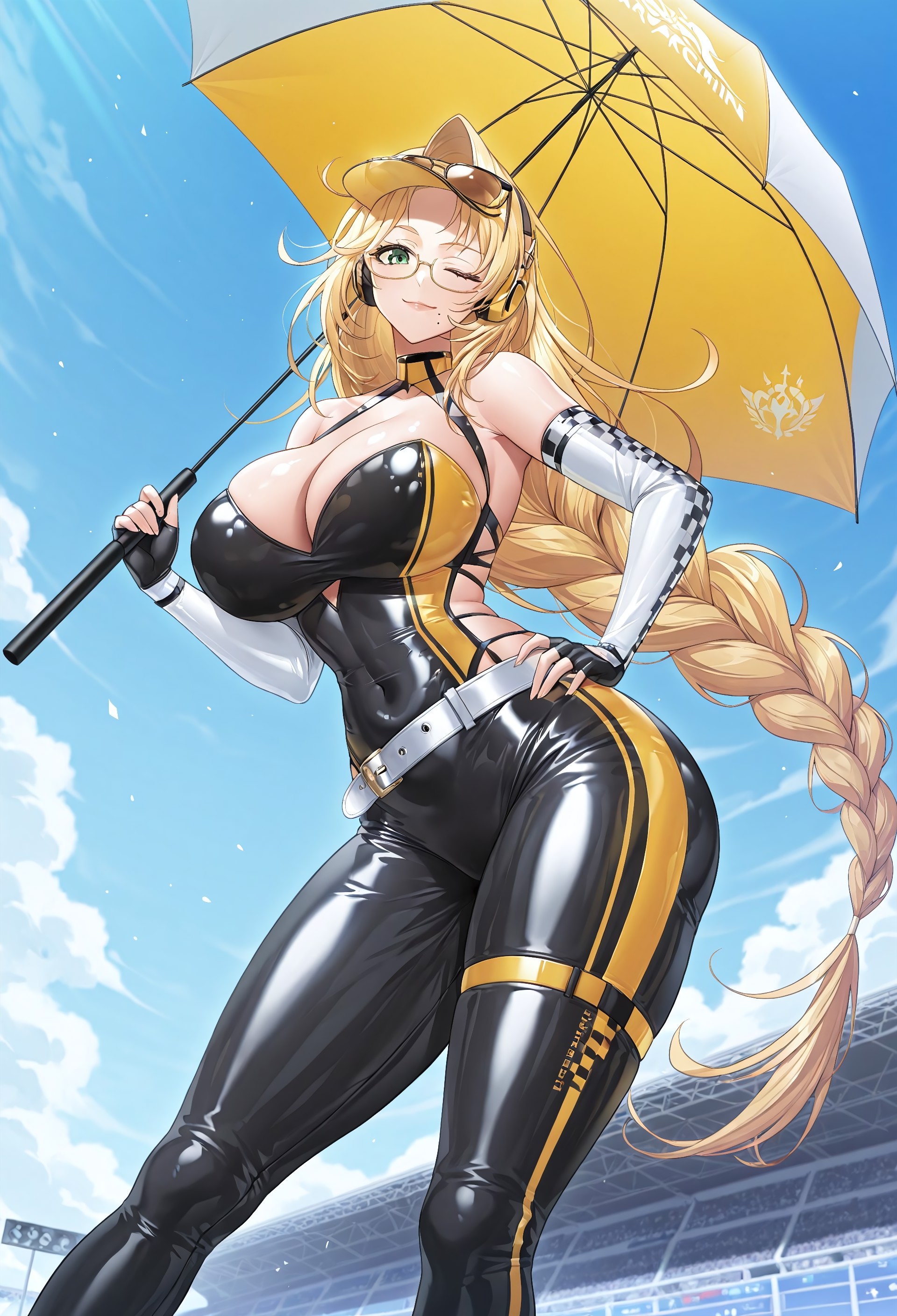 17番目の衣装:公式アレンジ衣装、レーシングクイーン衣装、サングラス、頭にメガネ、黄色いビーサー帽、黒いヘッドフォン、レースクイーン、黒いレオタード、黄色のアクセント、オレンジのアクセント、チェック柄服、胸元露出、白いベルト、指なし手袋、黒い手袋、取り外し可能な袖、白い袖、黒いタイツ、袖に黄色のストライプ、光沢のある服、肌にぴったり