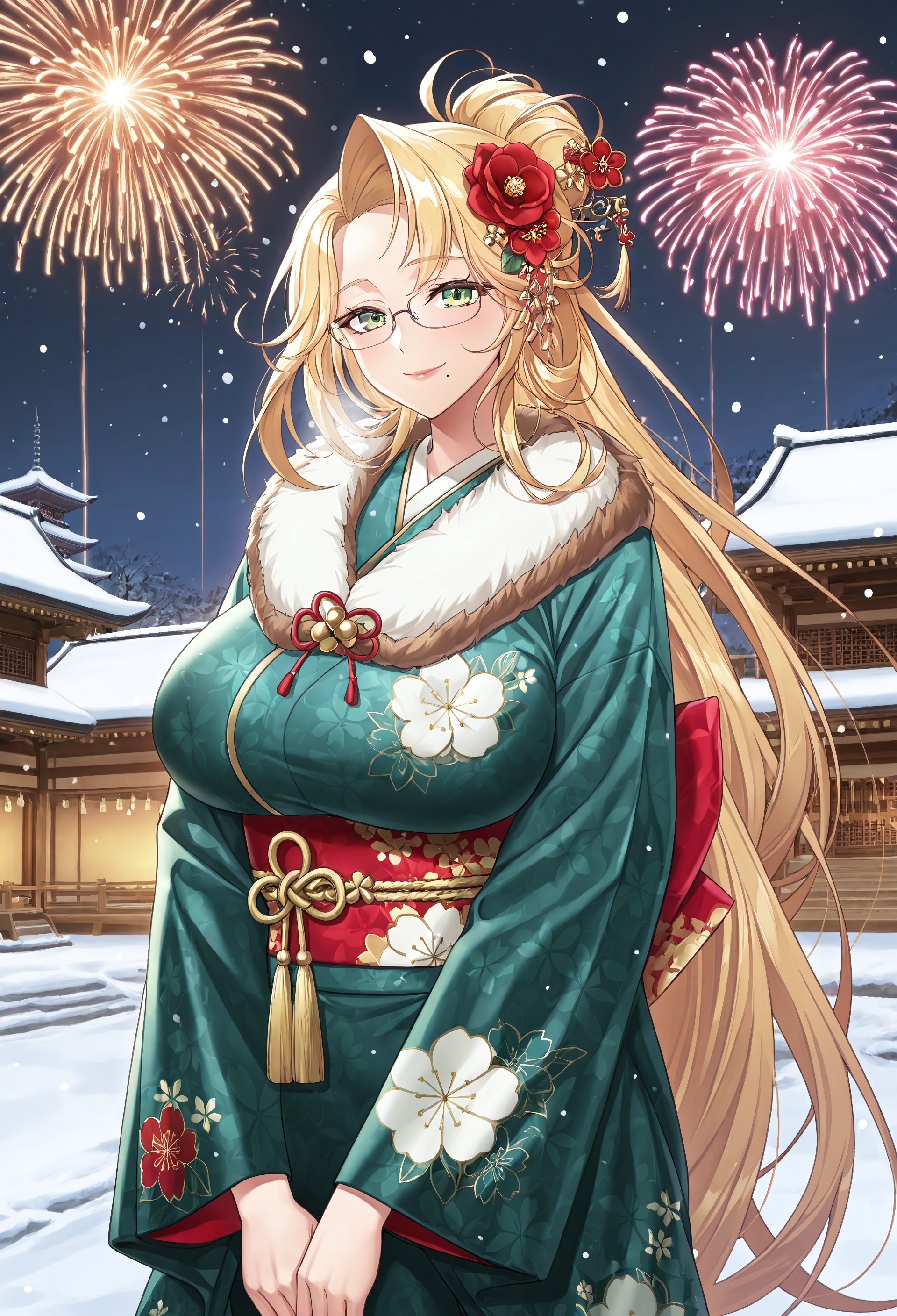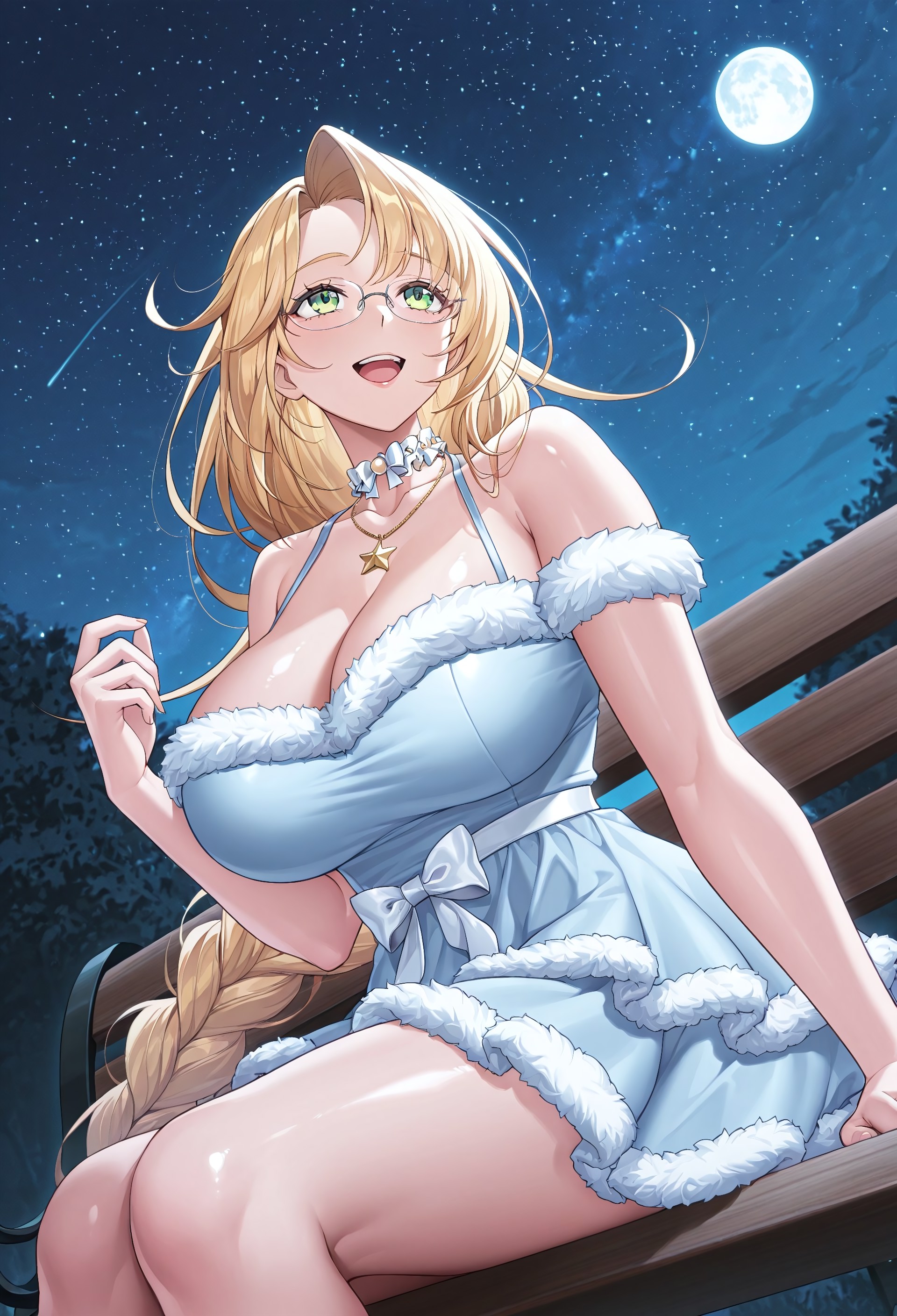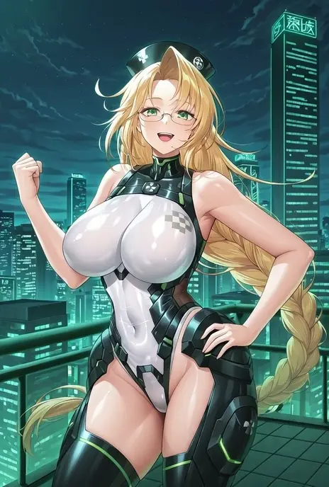 タグ:1girl, em1ly s1mmons, 成熟した女性, 曲線美, 金髪, 長髪, 非常に長い髪, 編みこみポニーテール, 緑の目, 眼鏡, (口の下のほくろ:0.7), 大きな胸, 下唇のみ