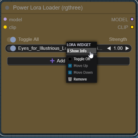 Load your LoRA models using the Power LoRA Loader by clicking “Add LoRA.” Once a LoRA is loaded, you can right-click on it and select “Show Info” to see its trigger words, example images, and a direct link to its Civitai page.
