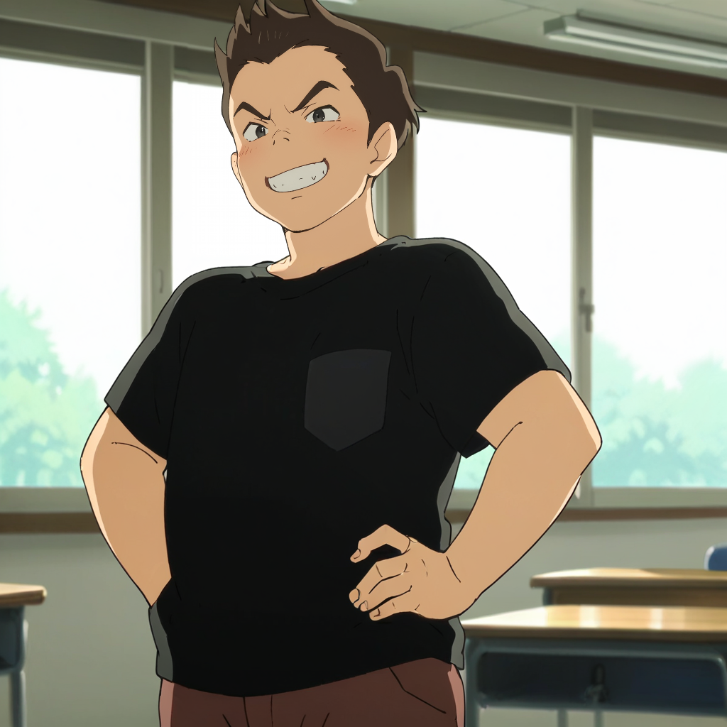 衣装1:男性、ぽっちゃり、茶色の髪、黒い目、黒のTシャツ、茶色のショートパンツ、赤い靴