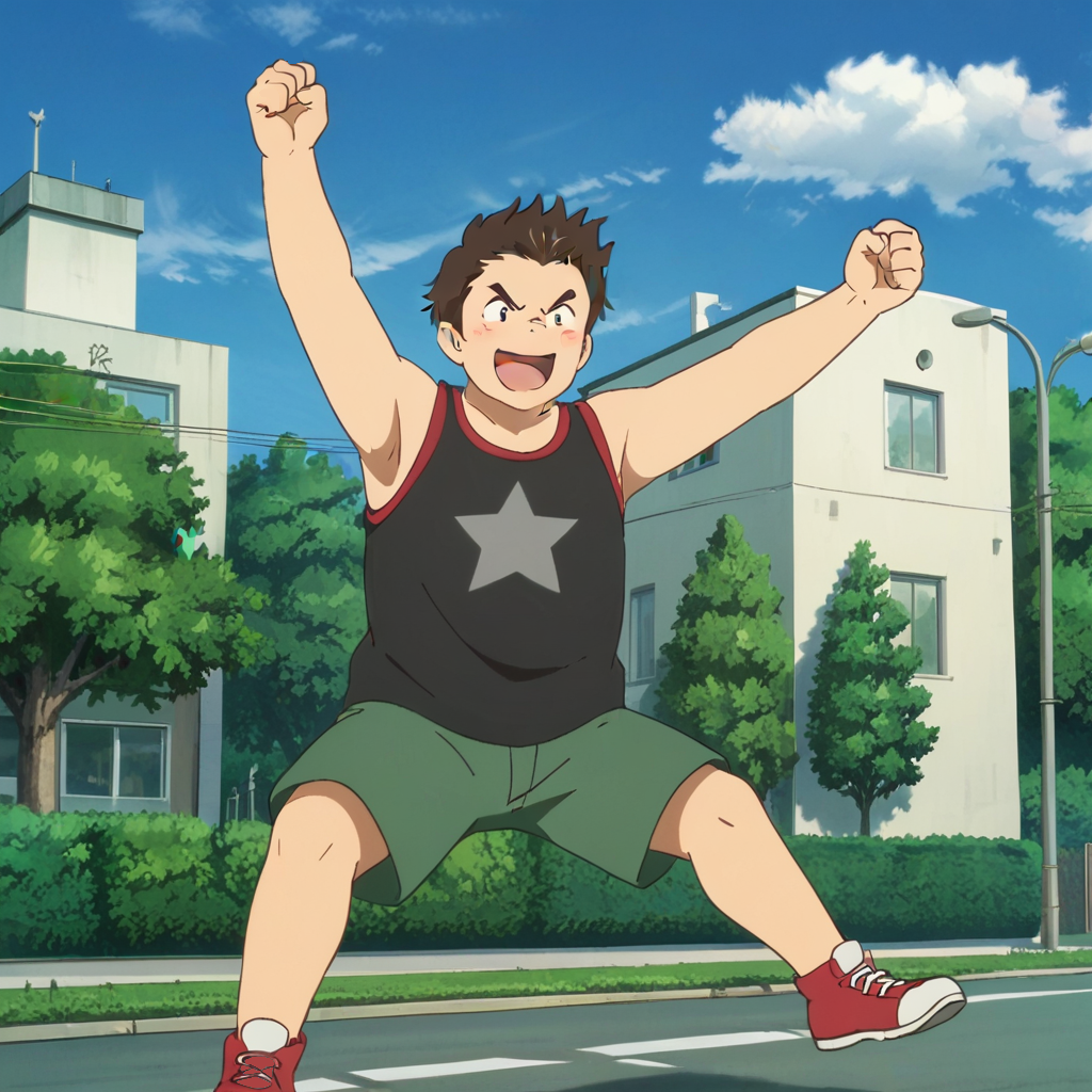 衣装2:男性、ぽっちゃり、茶色の髪、黒い目、タンクトップ、緑のショートパンツ、赤い靴