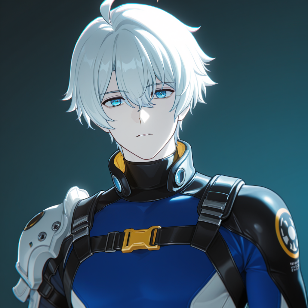 短髪、白髪、眉間の髪、青い目、アホ毛