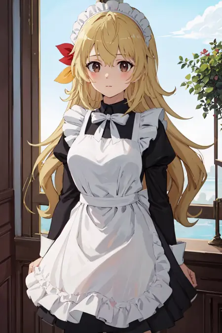 ((best quality, high quality, masterpiece, highres)), yifa, solo, 1girl, blush, maid, hair ribbon, white bow, long sleeves, cowboy shot, looking at viewer