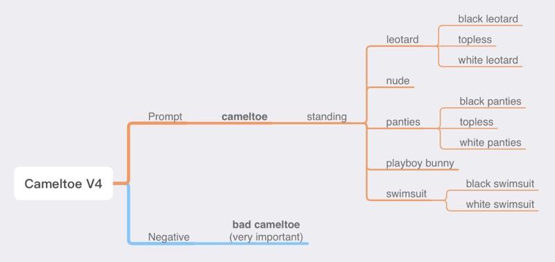 V4では、ネガティブトリガー語「bad cameltoe」の学習に20枚の画像を新たに投入しました。ネガティブプロンプトに「bad cameltoe」というトリガー語を追加することで、V3と比較してより高い下限性能が得られ、出力画像の安定性も高まります。