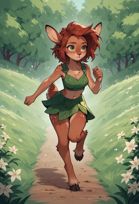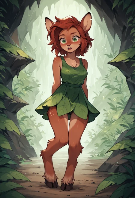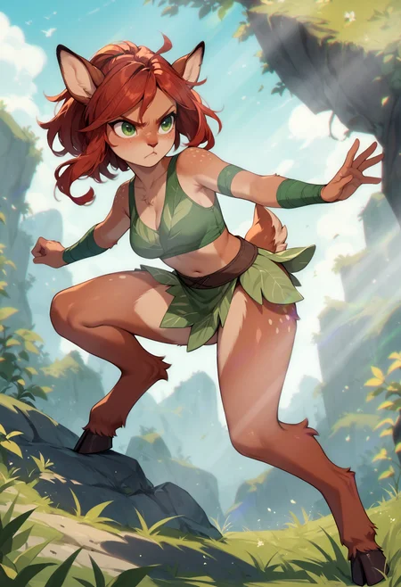 (肯定的プロンプト)elora、シカの耳、シカの尾、赤髪、短髪、緑の目、動物の耳、体の毛、フューリーな女性、肌の黒い女性、そばかす、体の毛、