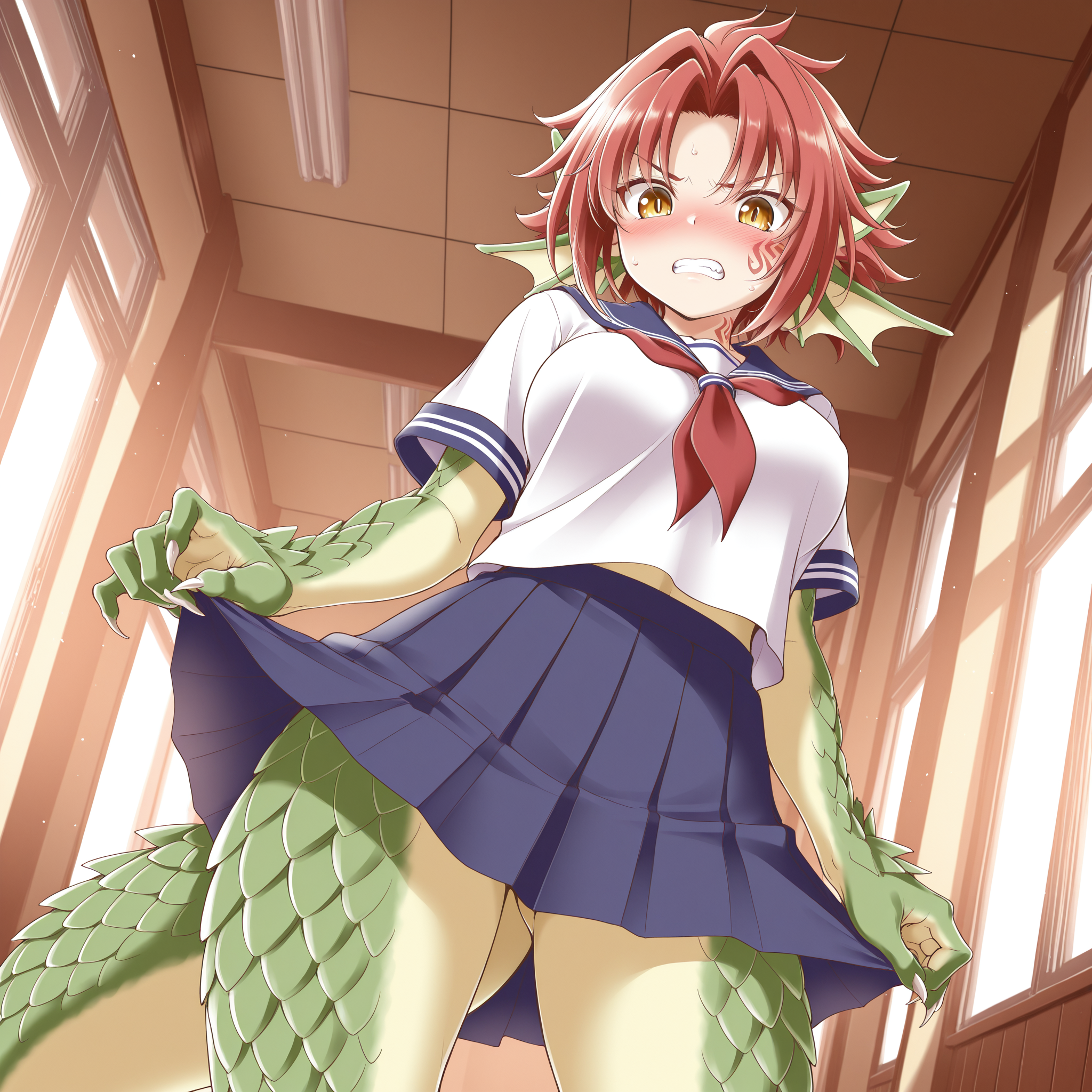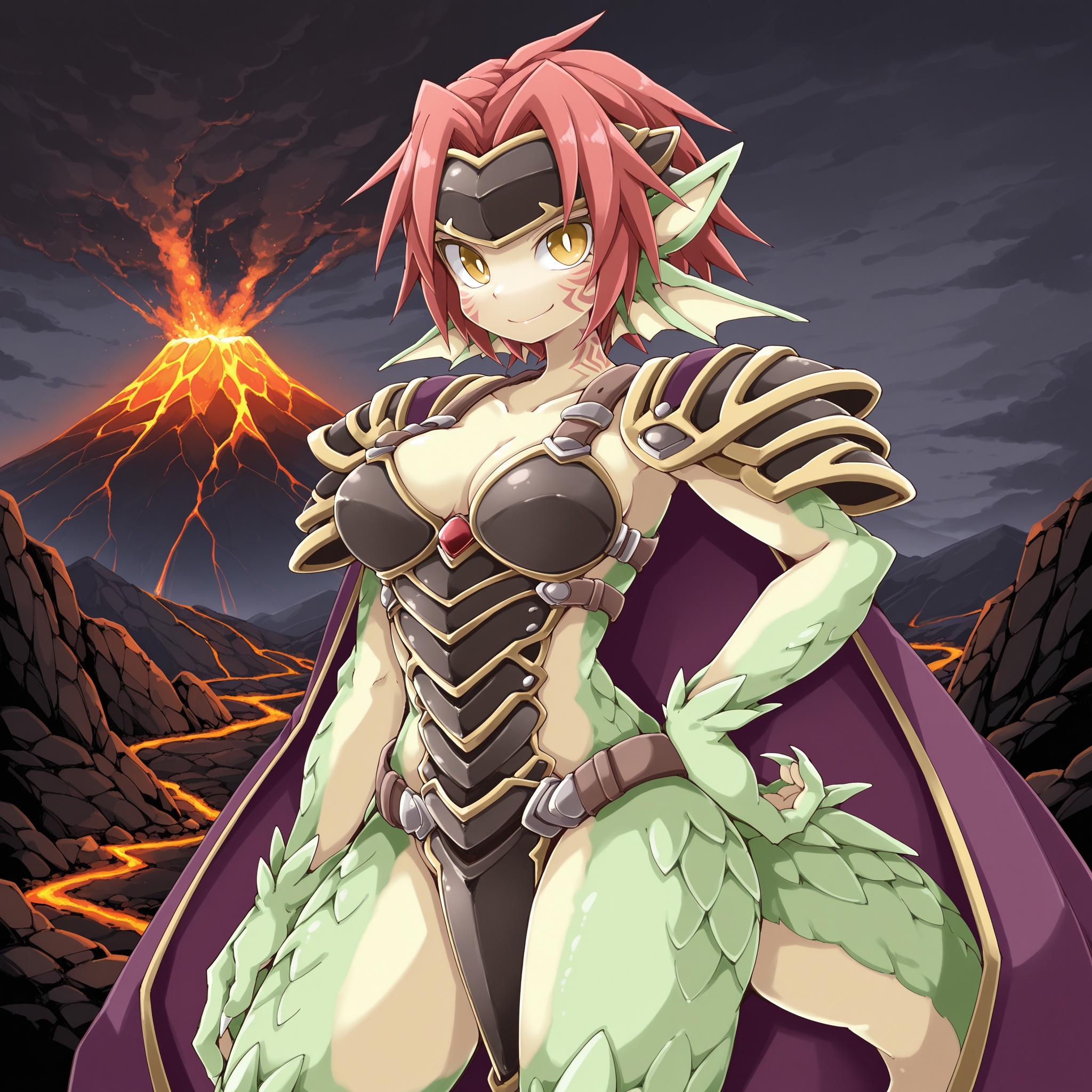 berrymgq, granberia, monster girl, dragon girl, green scales, yellow skin, red hair, short hair, dragon ears, head fins, yellow eyes, slit pupils, bright pupils, facial tattoo, shoulder tattoo, claws, dragon tail, forehead protector, purple & gold cape, shoulder armor, boobplate