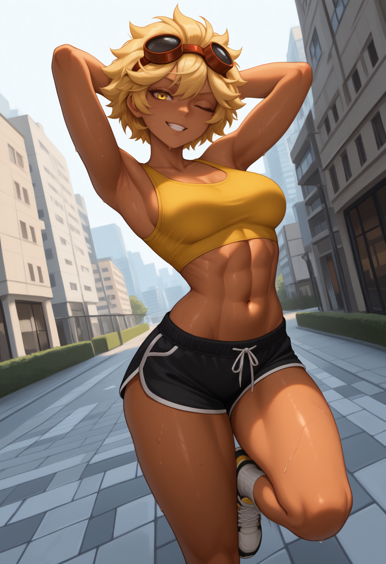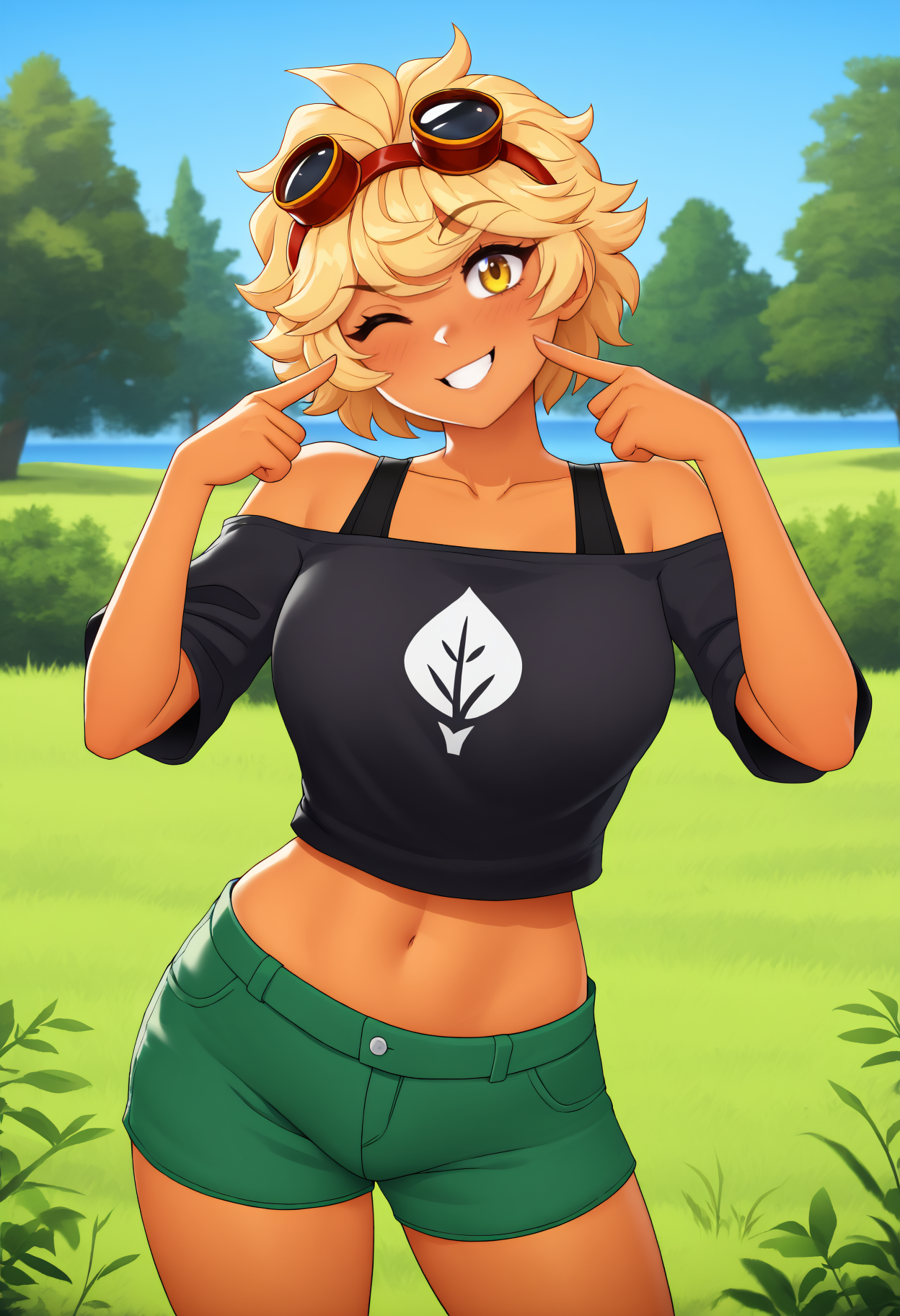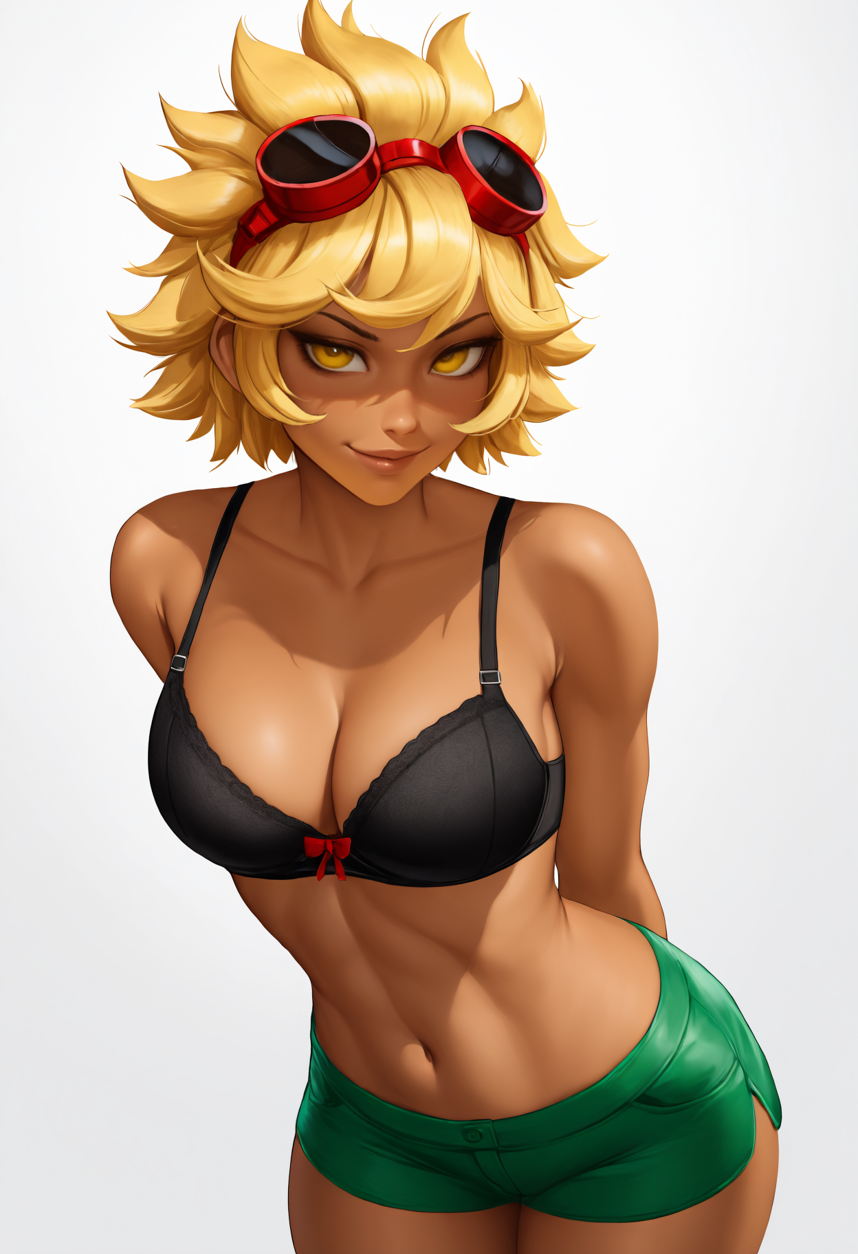 기본 복장: 머리에 안경, 검은 티셔츠, 프린트 티셔츠, 어깨 드러난 티셔츠, 짧은 티셔츠, 검은 브라, 브라 끈, 녹색 붕대, 붕대 감긴 팔, 붕대 감긴 손, 녹색 반바지, 짧은 반바지, 드러난 어깨, 복부, 배꼽