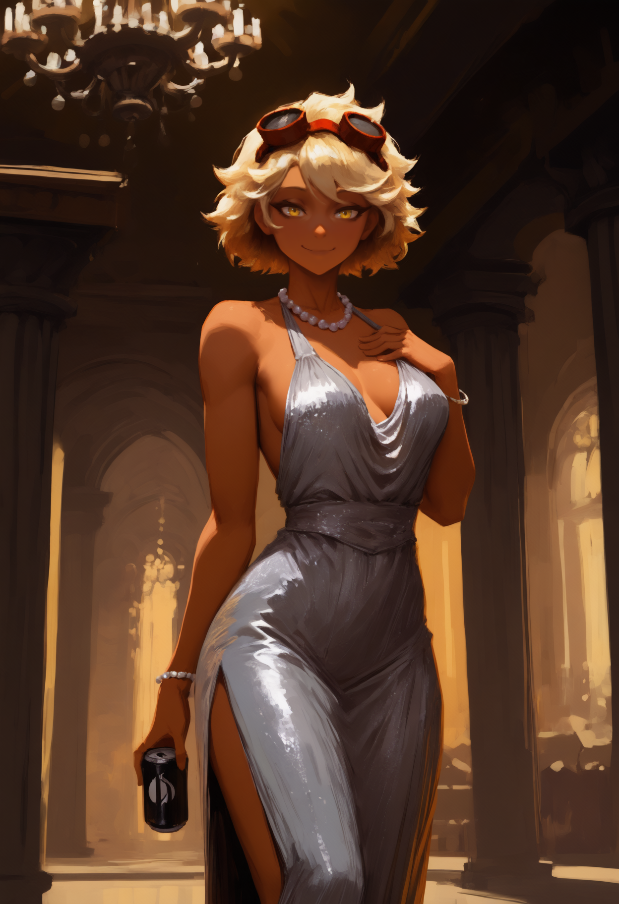 외모: 검은 피부를 가진 여자, 단발, 금발, 노란 눈