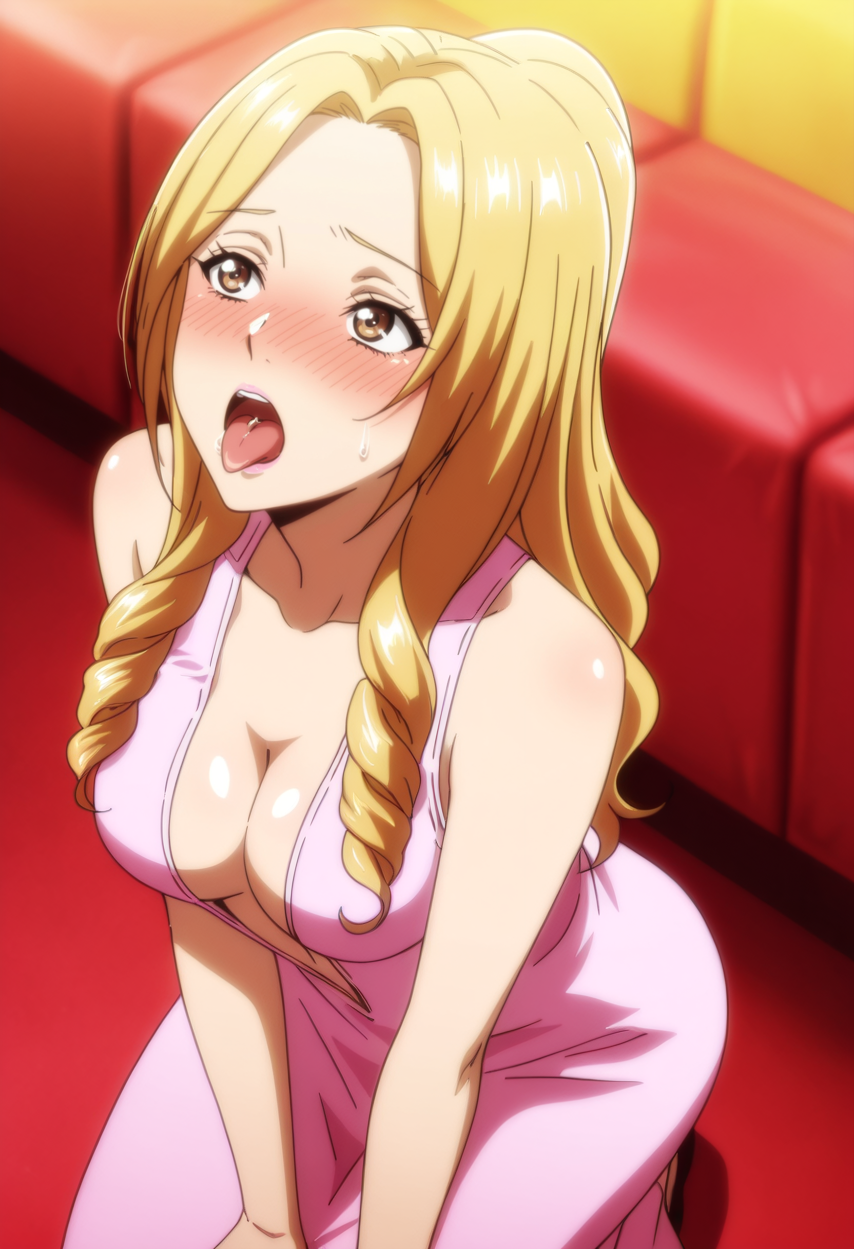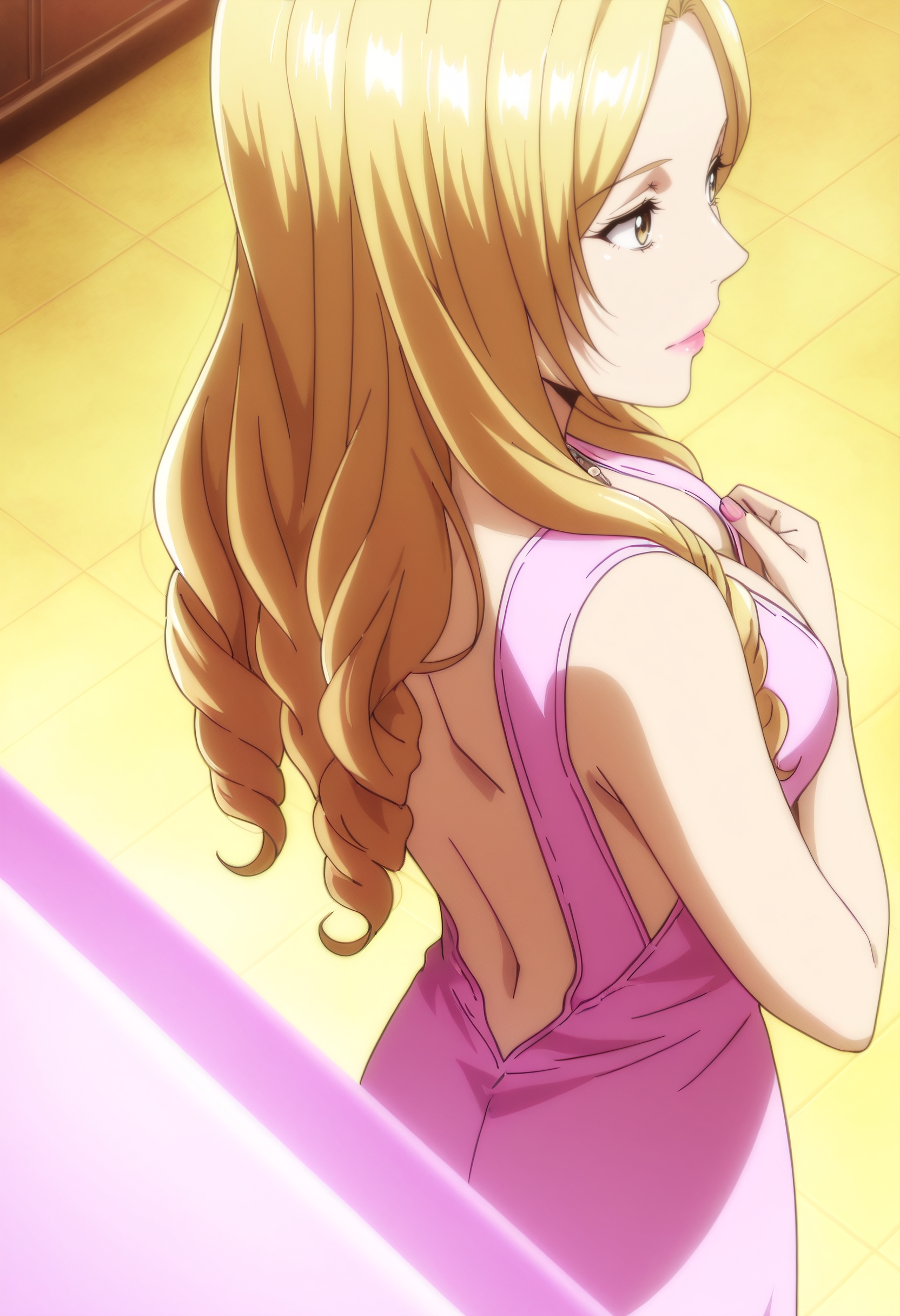 HibikiDress, 립스틱, 드레스, 가슴 노출, 메이크업, 어깨 노출, 입술, 분홍 드레스, 어깨 드러냄, 깊은 네크라인, 긴 드레스, 브라 없음, 어깨 드러냄 드레스, 중앙 열림,