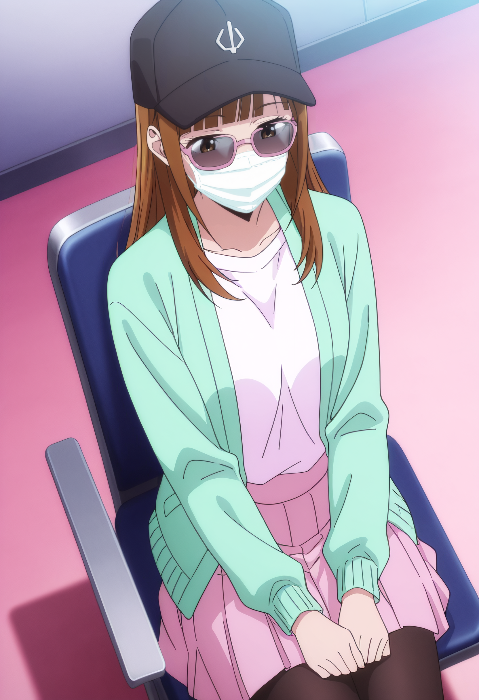 ReikaJacket, 셔츠, 마스크, 외과용 마스크, 마스크, 선글라스, 안경, 녹색 자켓, 긴 소매, 자켓, 모자, 야구 모자, 카디건, 스타킹, 검은 스타킹, 검은 모자, 치마, 분홍 치마, 주름 치마, 분홍 프레임 안경, 녹색 카디건, 오픈 옷, 드레스,