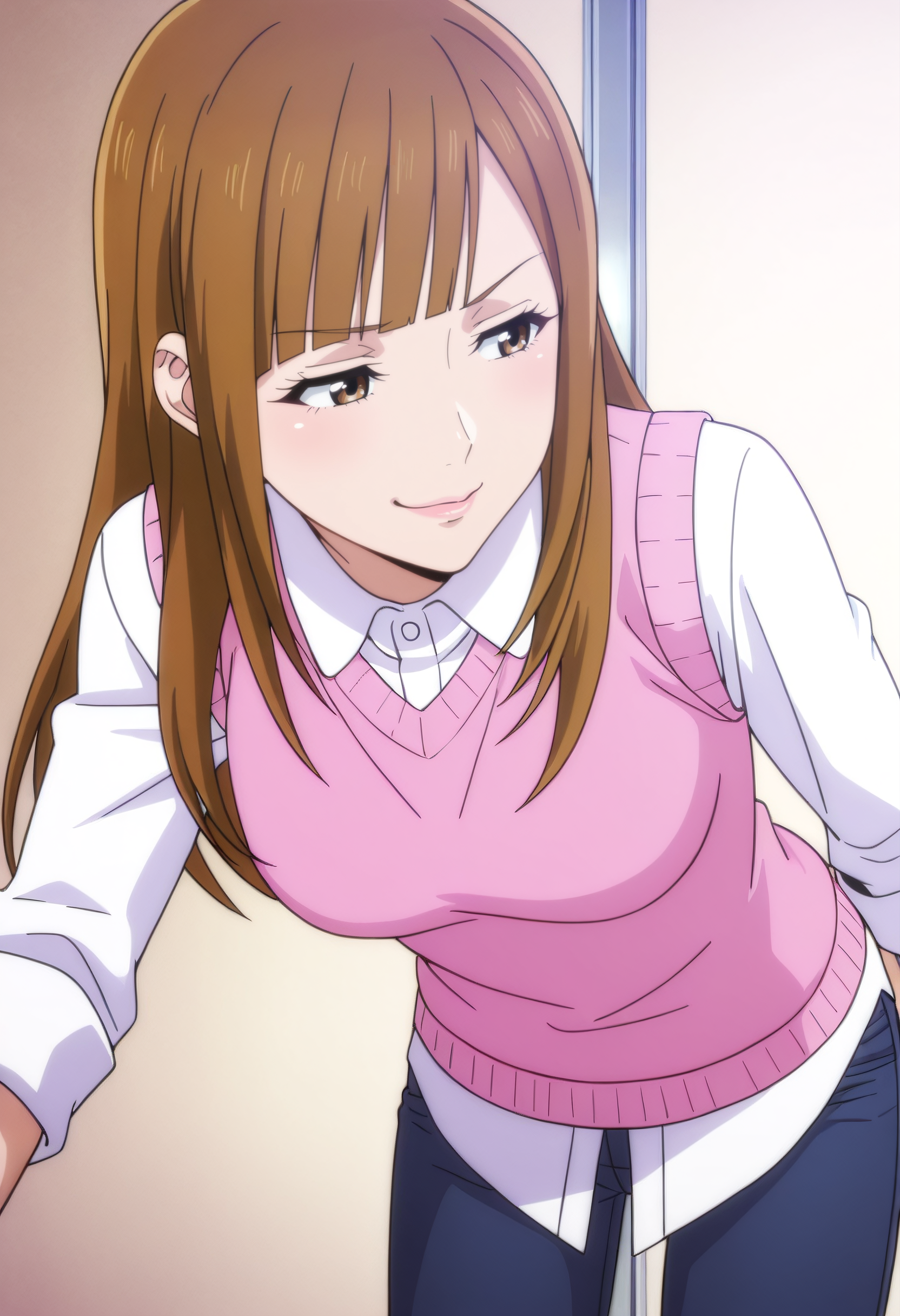 ReikaVest, 셔츠, 스웨터 베스트, 분홍 스웨터 베스트, 흰 셔츠, 베스트, 칼라 셔츠, 분홍 베스트, 소매 말아 올린, 바지, 청바지, 데님, 긴 소매, 바지 말아 올린, 파란 바지,