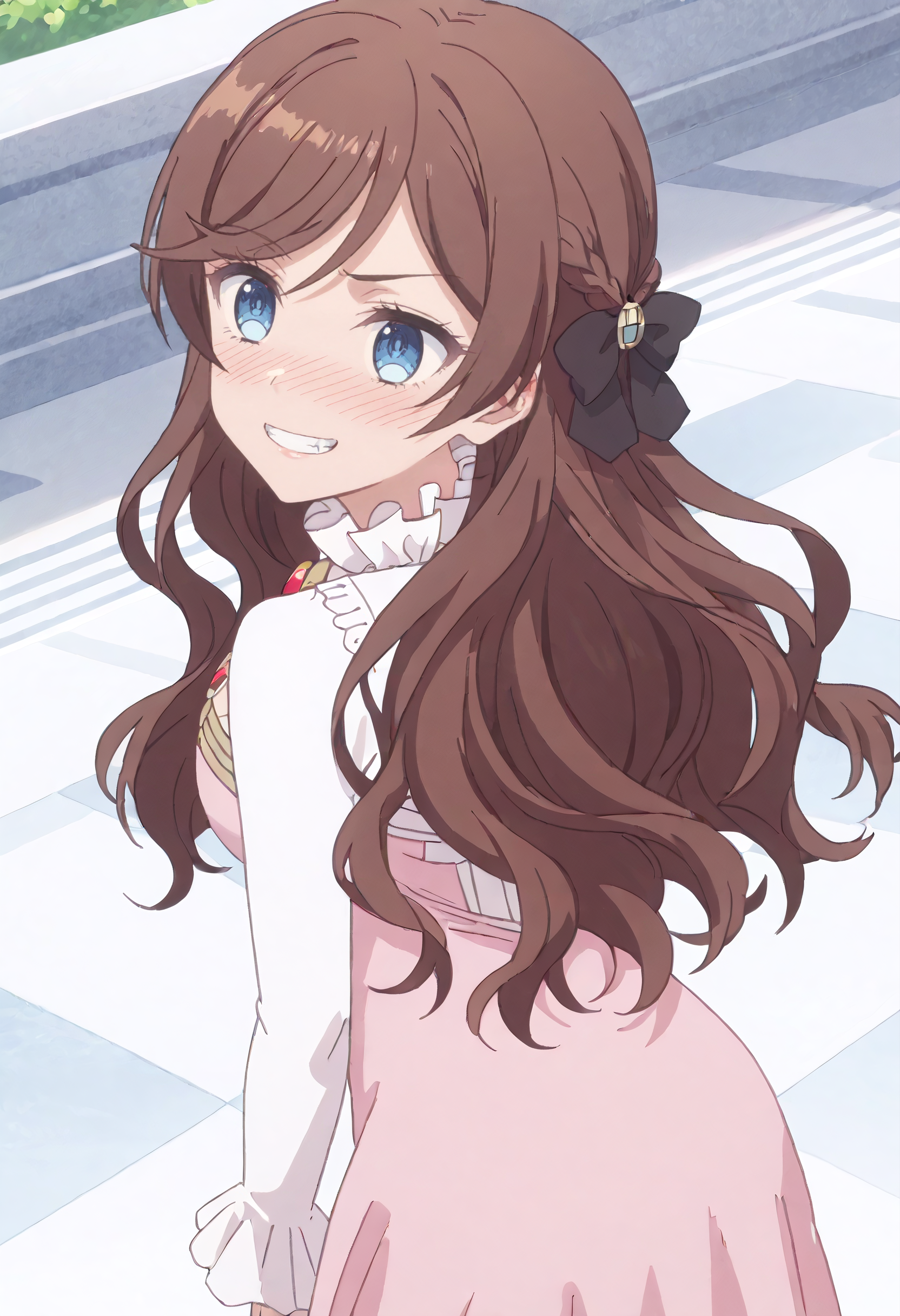 GracePiDress、ドレス、ロングスリーブ、ブローチ、ピンクドレス、ジュエリー、フリル、シャラ(衣類)、リボン、髪のリボン、ブラックリボン、衣類カットアウト、フリルカラー、フリルスリーブ、ロングドレス