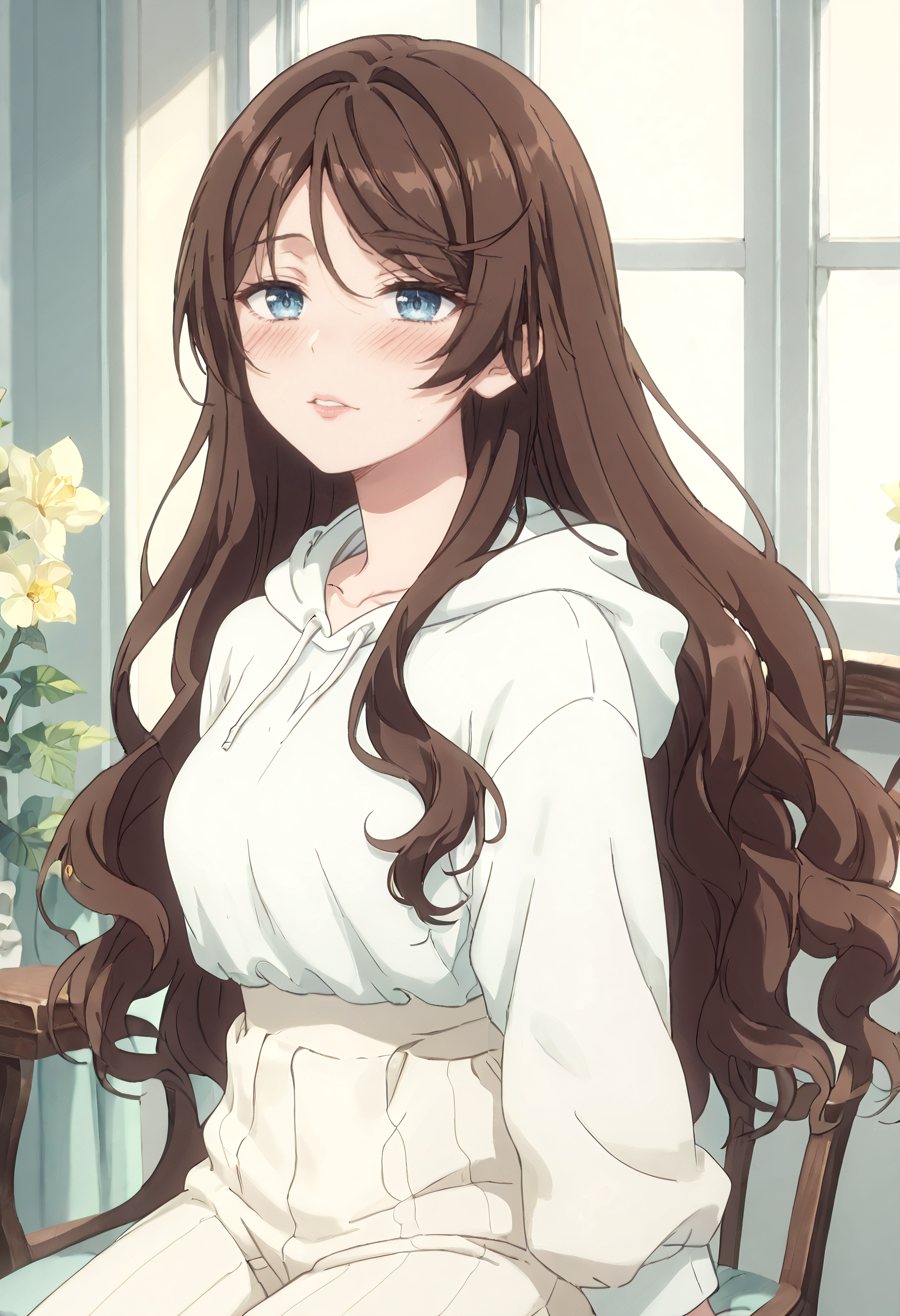 KTElizabeth、長い髪、茶色の髪、非常に長い髪、ウェーブヘア、青い目、髪を下ろした状態