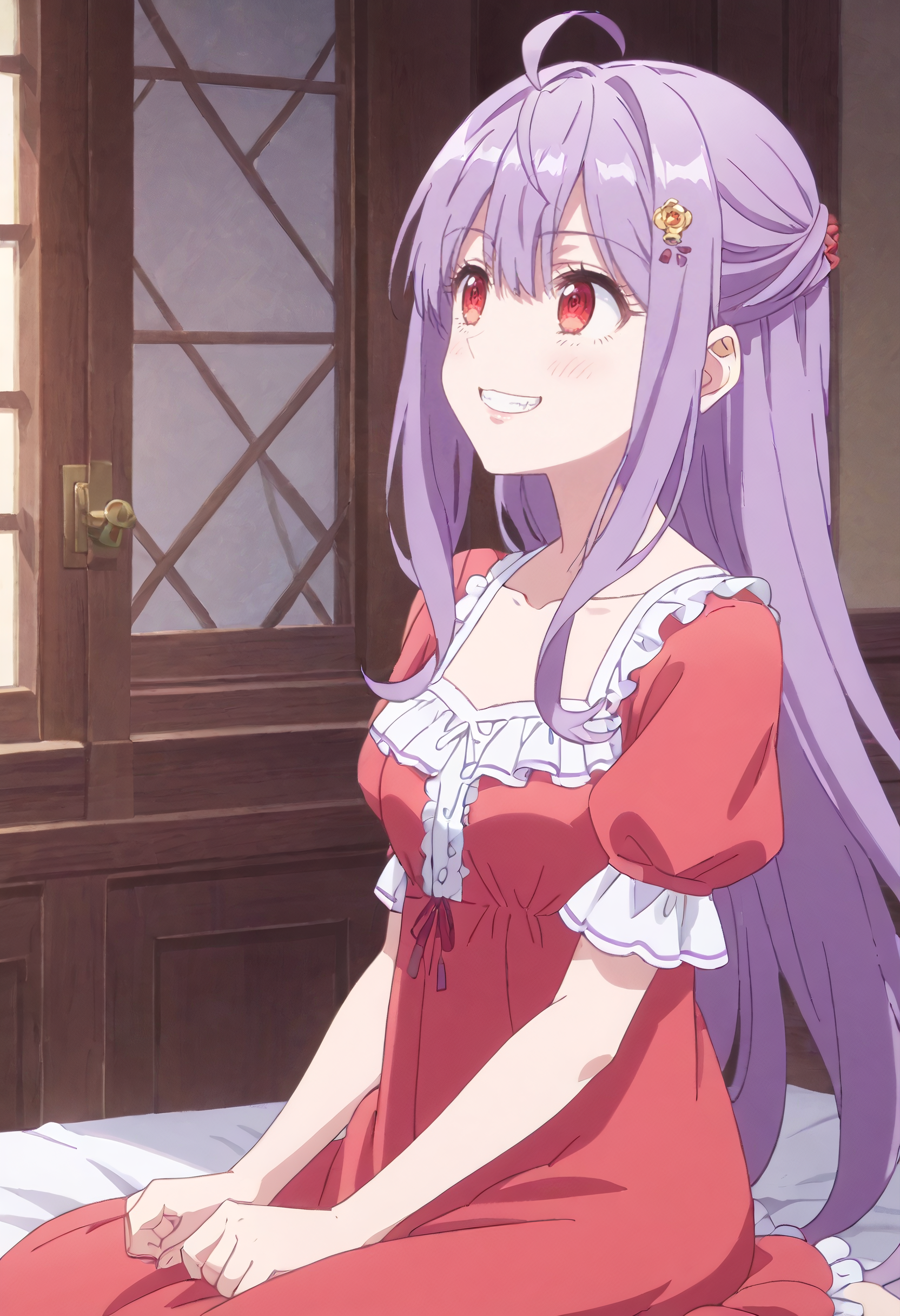 MiaSleepwear、ナイトガウン、フリル、パジャマ、ドレス、鎖骨、寝間着、フリル付きドレス、短袖、髪飾り、花、ロングドレス、ふわふわ袖、赤いドレス