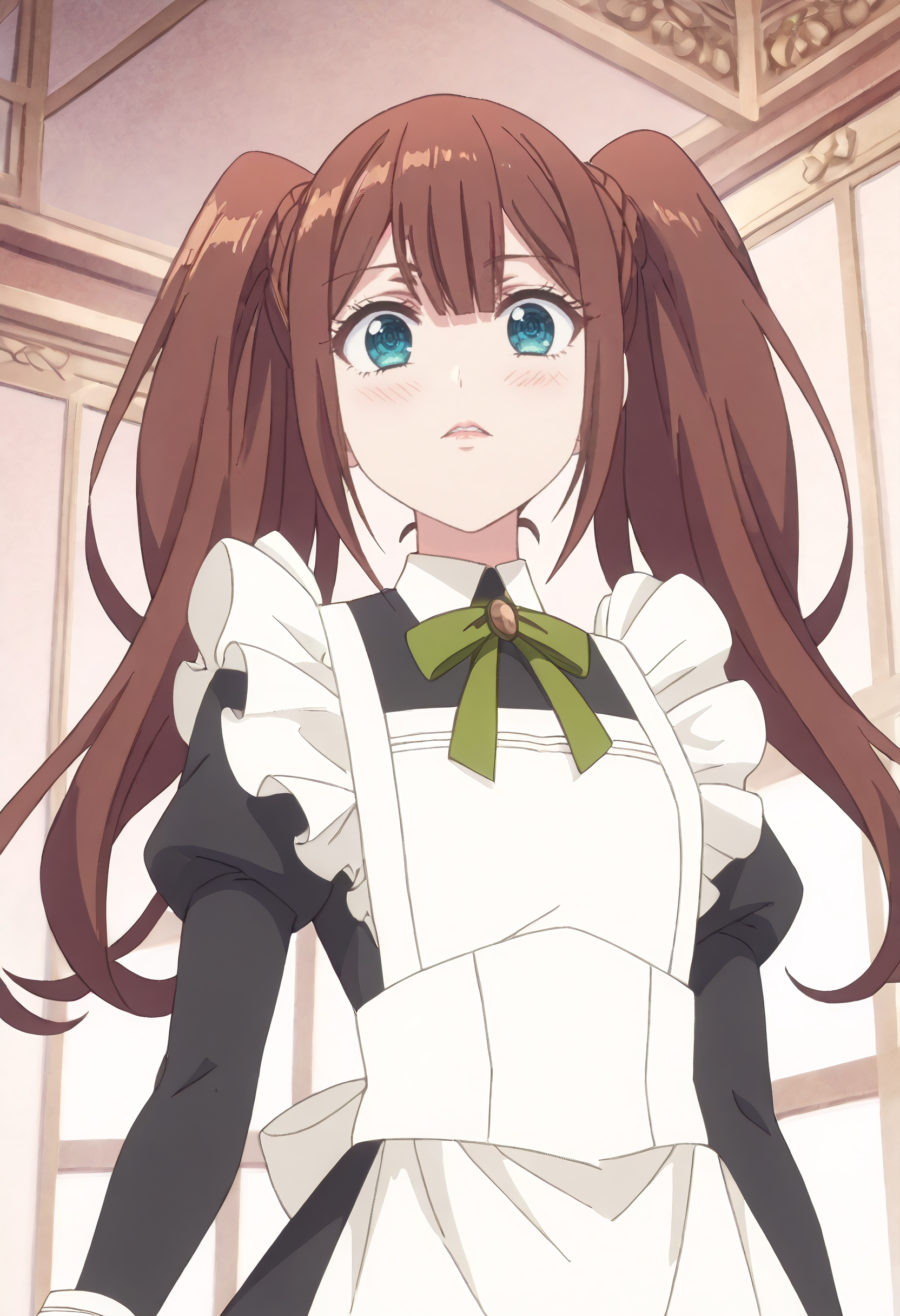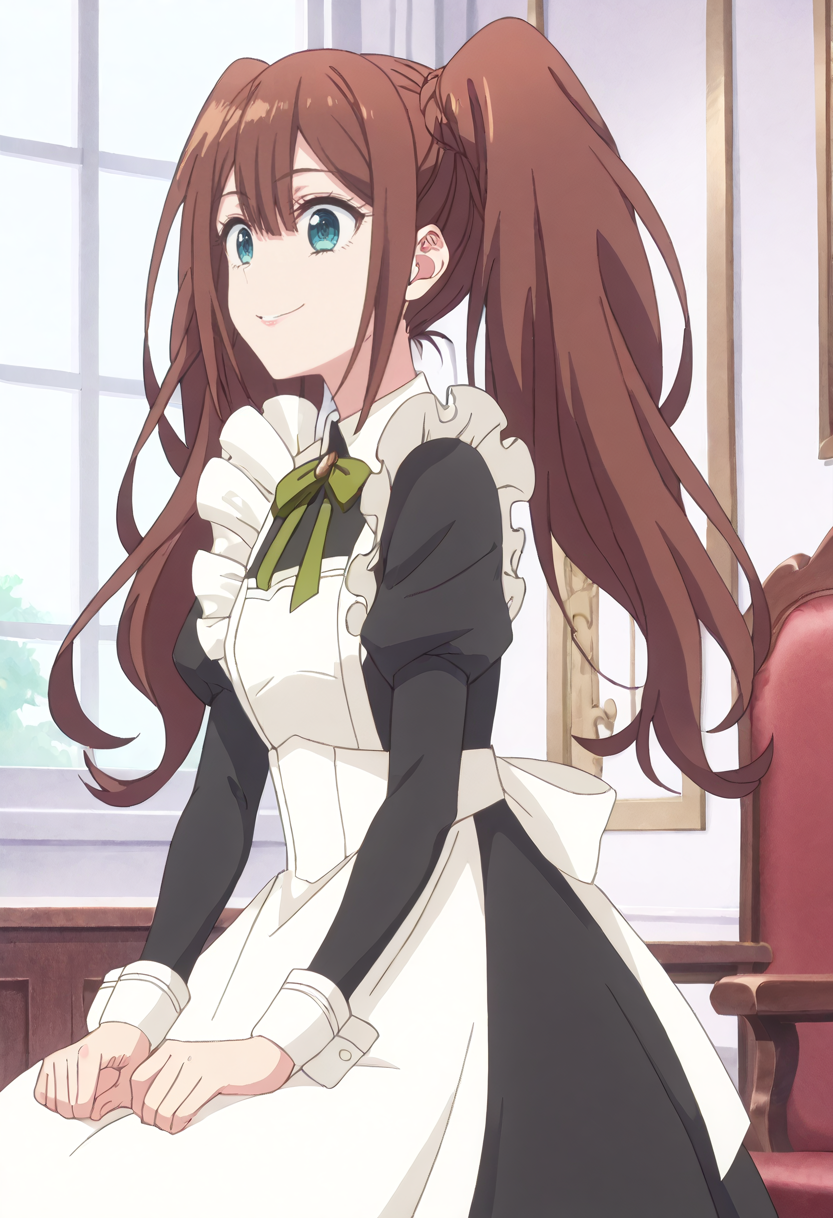 LenaOutfit、メイド、エプロン、メイド頭飾り、メイドエプロン、黒いドレス、白いエプロン、ドレス、フリル、フリル付きエプロン、enmaided、リボン、緑のリボン、 bow、長袖、ふくらはぎ袖、ネックリボン、ジュリエット袖、カラー付きドレス、緑の bow、袖口、背中リボン