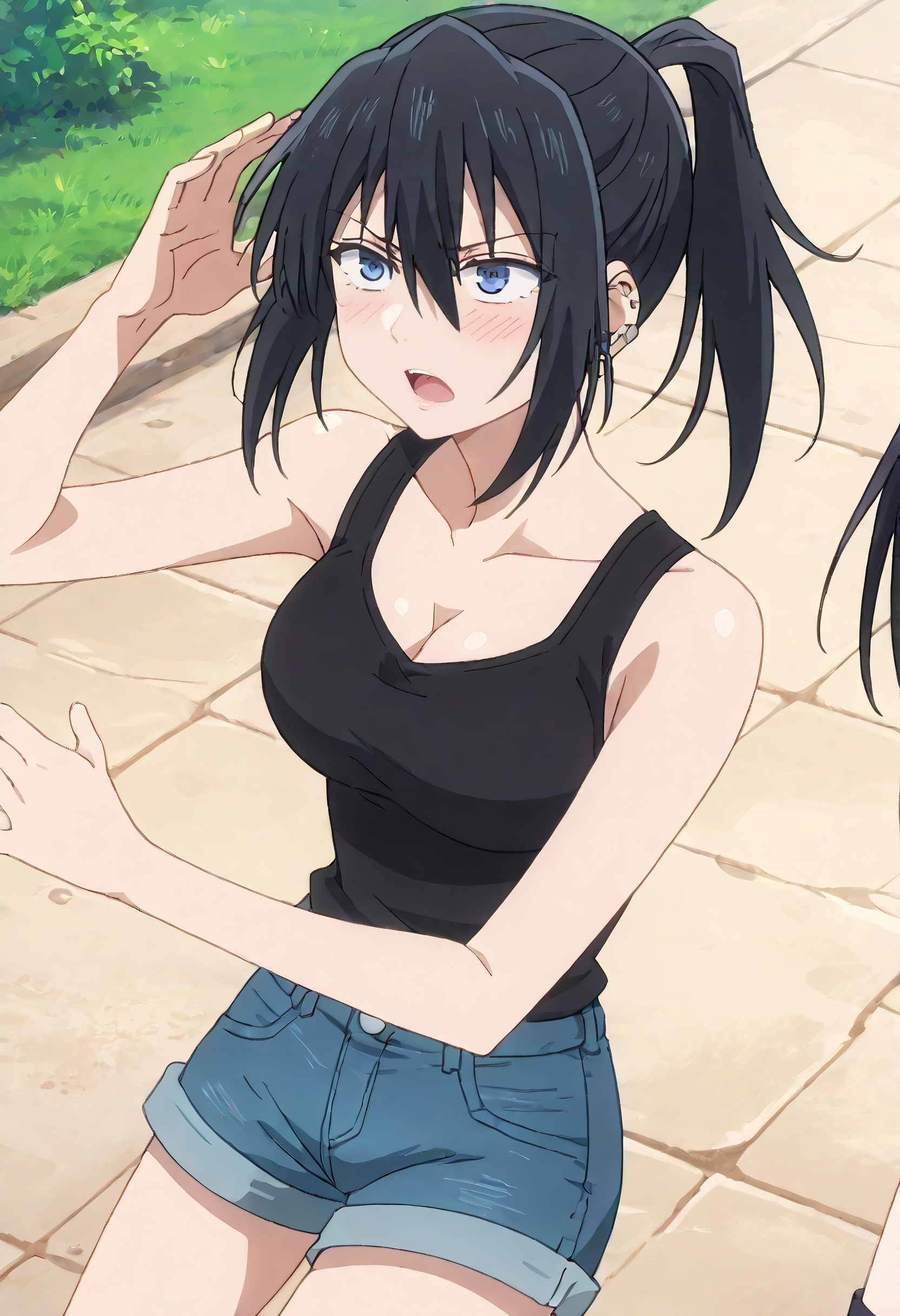 AnemoneTanktop、タンクトップ、ブラックタンクトップ、黒いシャツ、シャツ、胸元露出、肩出し、ショートパンツ、ノースリーブ、短いショートパンツ、腕出し、デニム、デニムショートパンツ、青いショートパンツ、