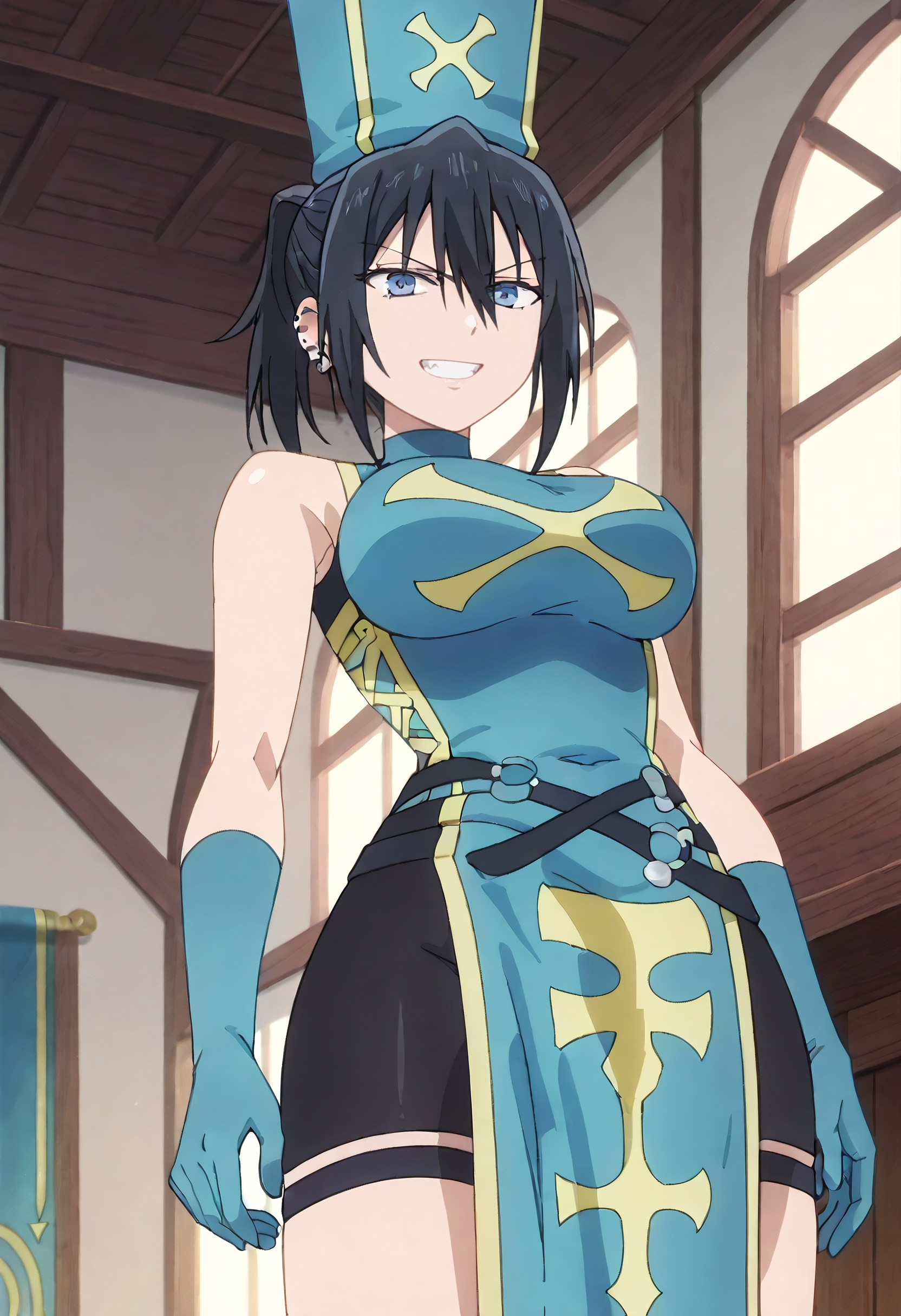 AnemoneOutfit、ノースリーブ、肩出し、帽子、手袋、青い手袋、青い帽子、ミトラ、肘まで手袋、ドレス、青いドレス、タバード、タートルネック、ショートパンツ、黒いショートパンツ、自転車用ショートパンツ、青い頭部装具、ベルト、十字、青いタバード、肌にフィット、アンダーサット、太ももストラップ、十字模様、骨盤カーテン、