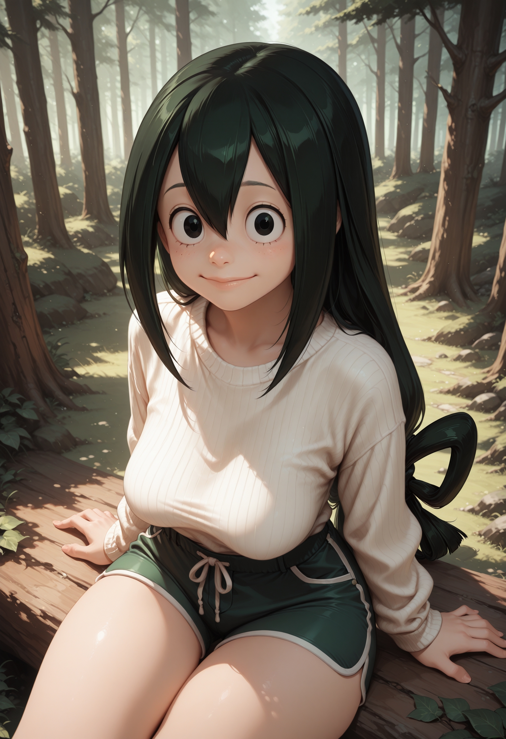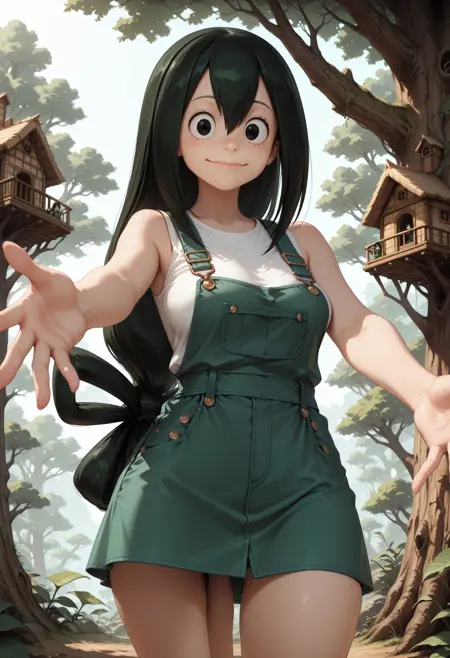 (肯定的プロンプト)asui, asui tsuyu, 緑色の髪, 黒い目, 長い髪, 目の間の髪, 髪の輪, 低く結んだ長い髪,