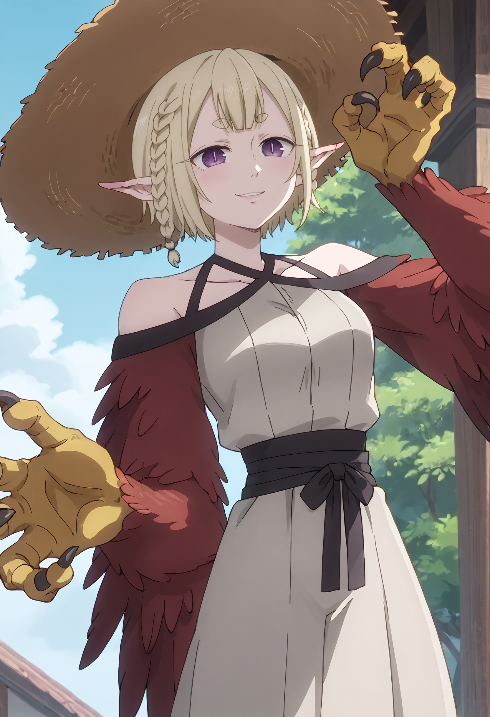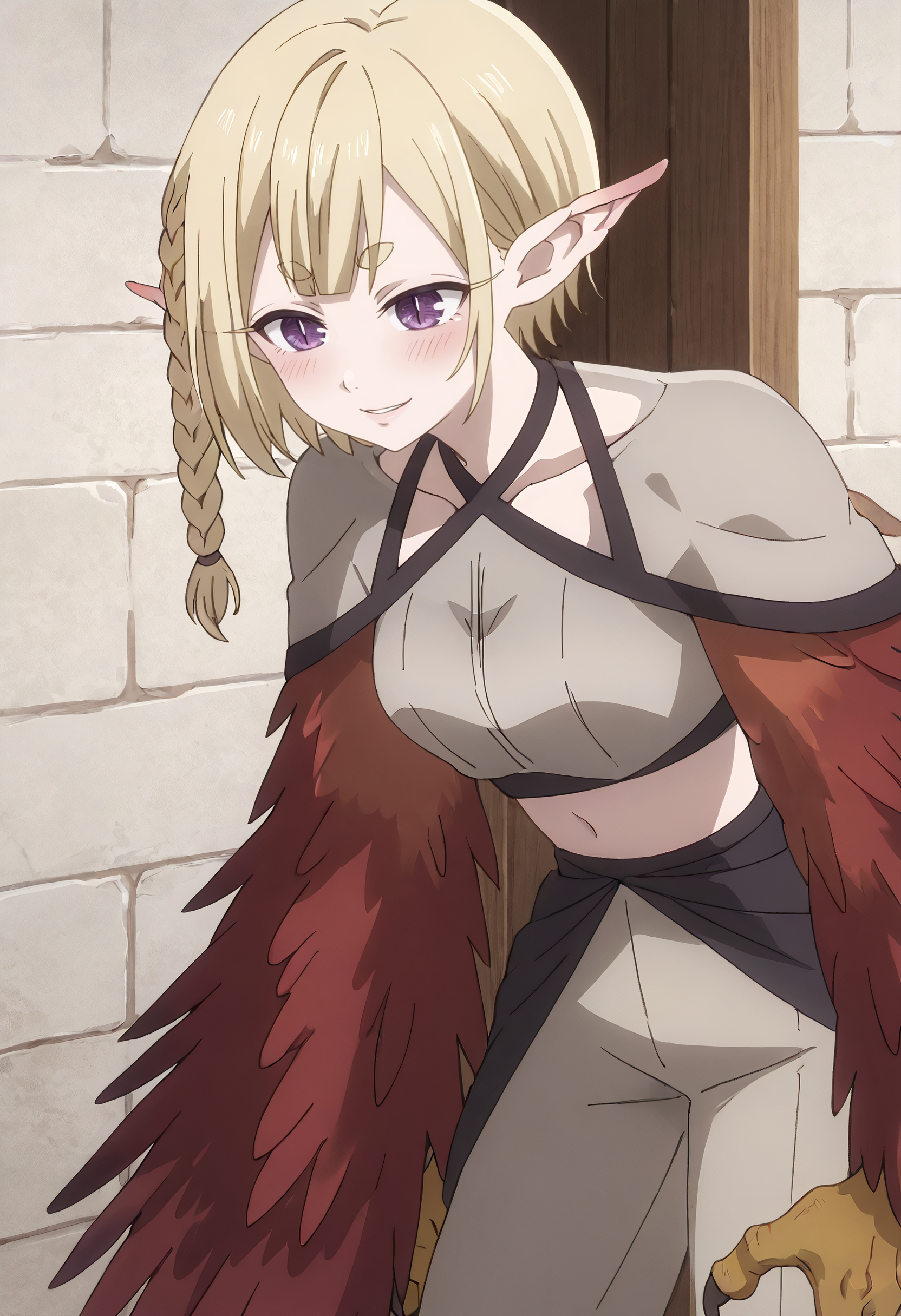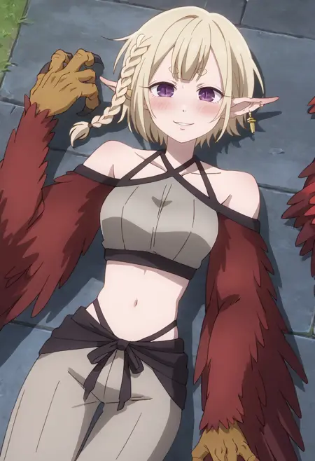 KYTHapi, 금발, 날카로운 귀, 단발, 땋은 머리, 두꺼운 눈썹, 짧은 눈썹, 단일 땋은 머리, 옆 땋은 머리, 몬스터 걸, 보라색 눈, 좁은 동공, 하피, 날개 달린 팔, 갈고리, 날개, 깃털, 새 다리, 깃털 날개, 빨간 깃털, 발톱, 동물 손, 새 귀
