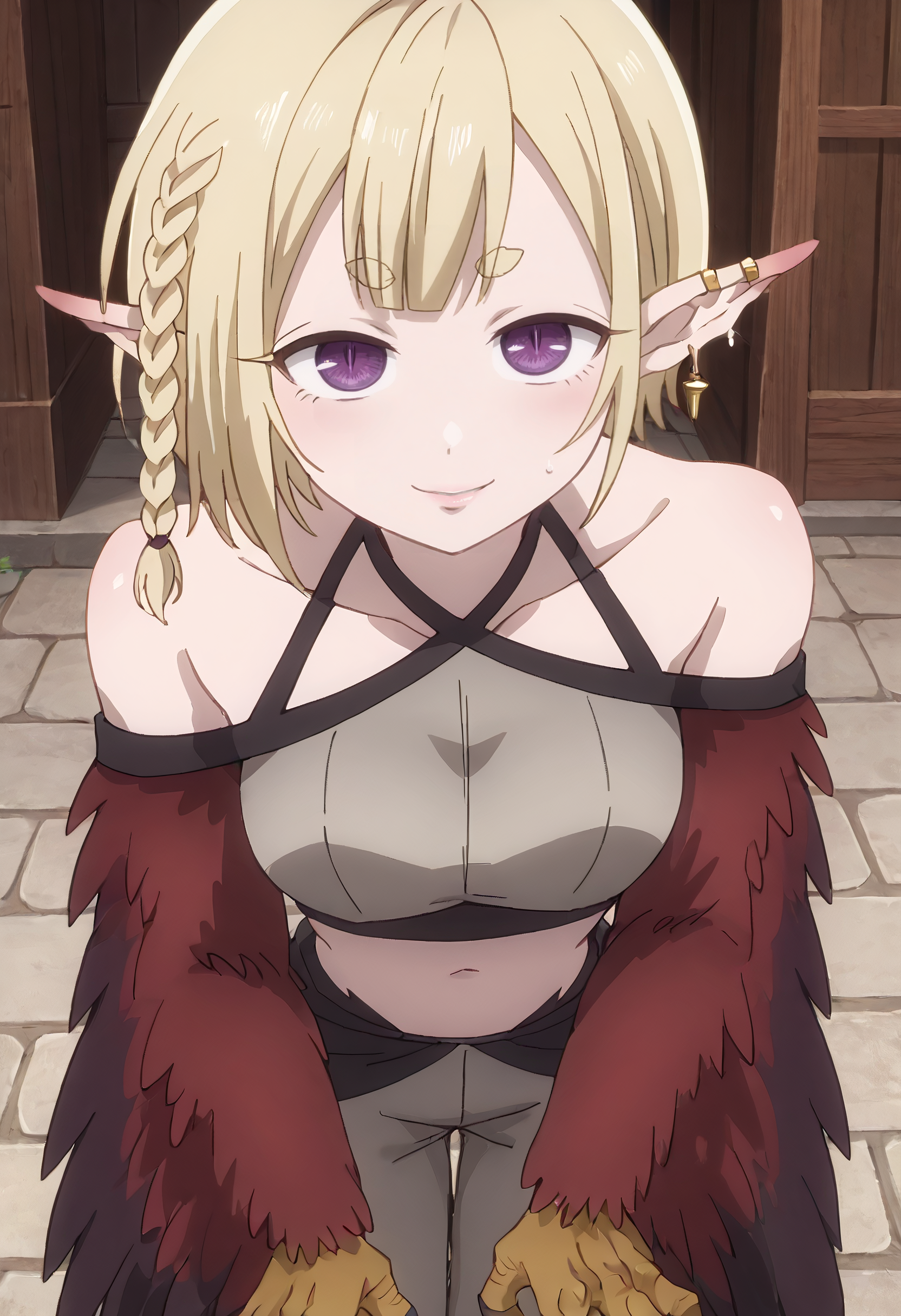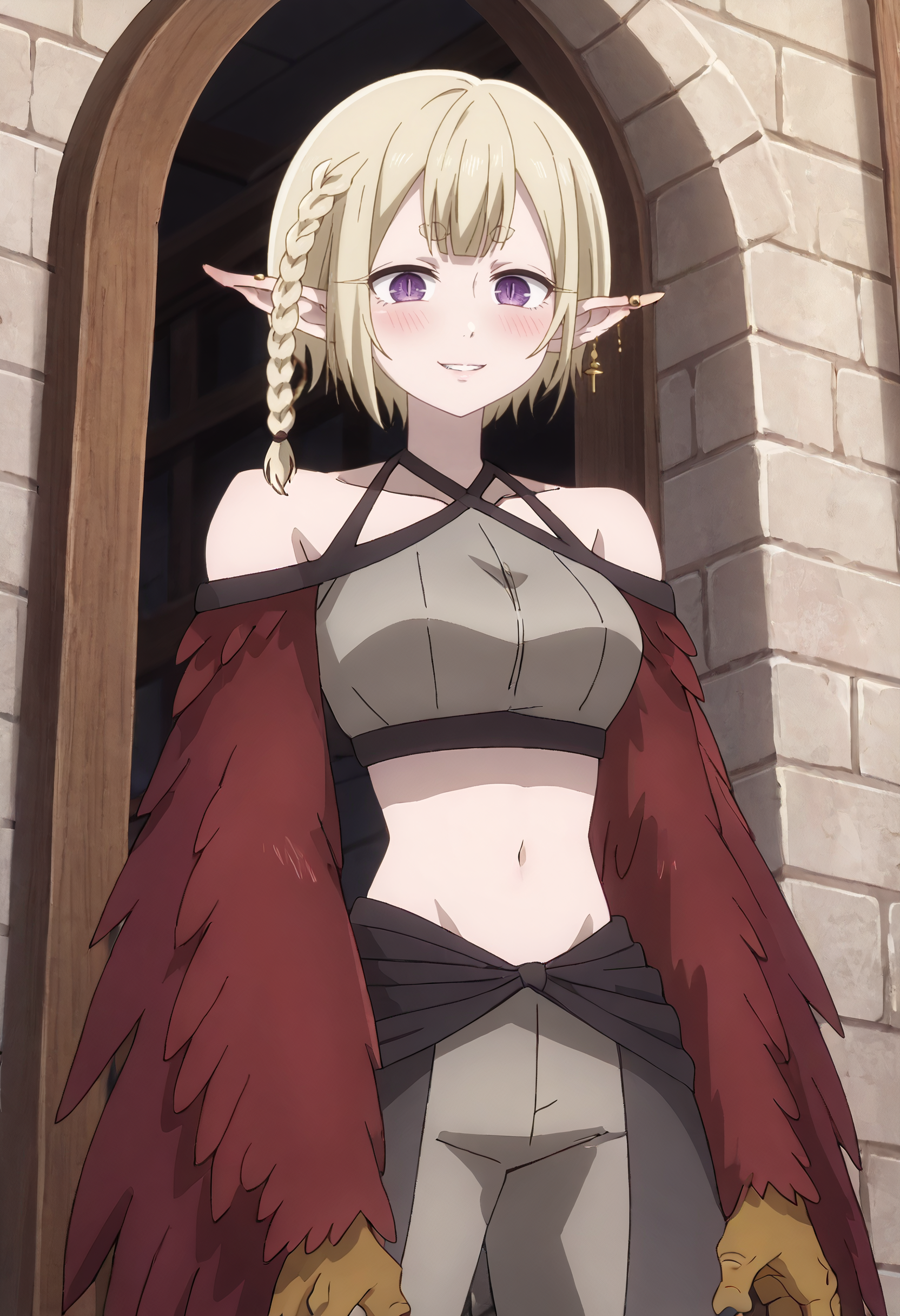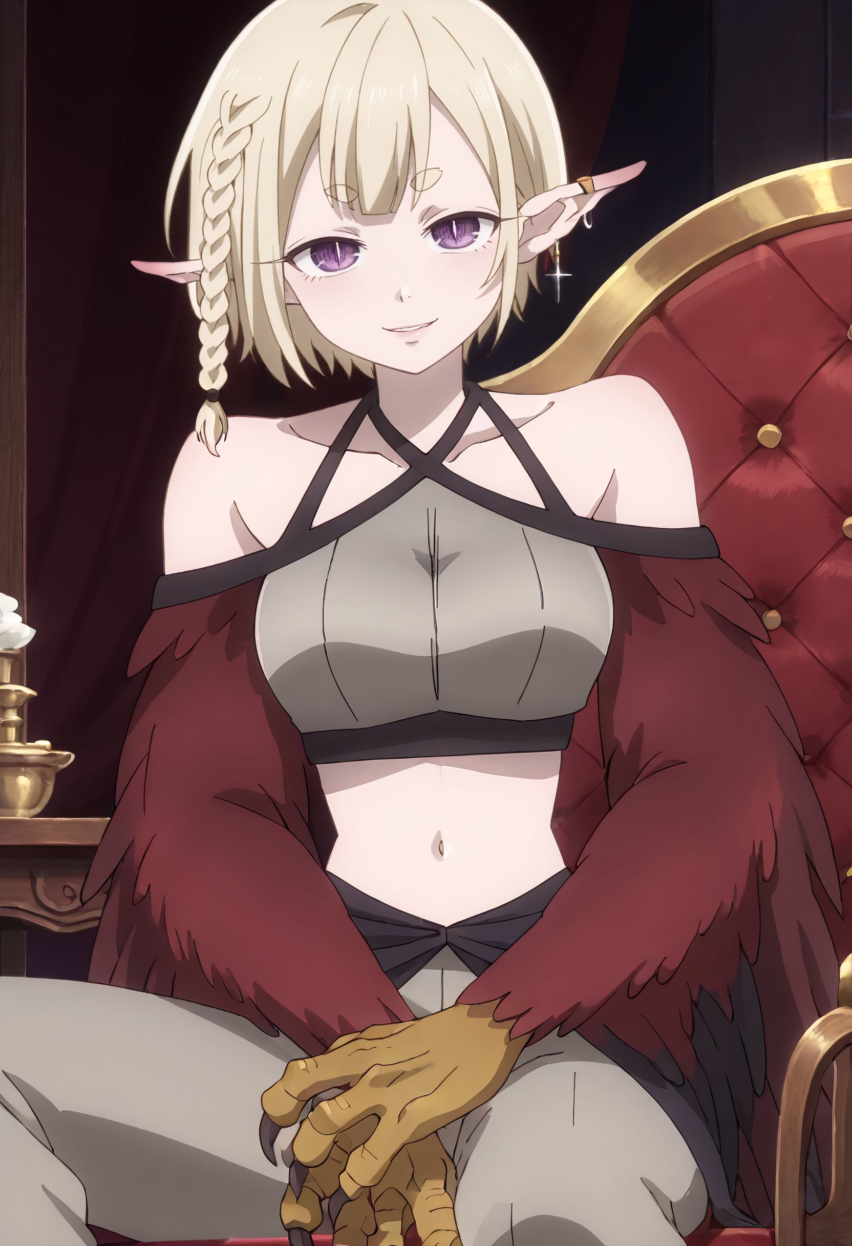 KYTHapi, 금발, 날카로운 귀, 단발, 땋은 머리, 두꺼운 눈썹, 짧은 눈썹, 단일 땋은 머리, 옆 땋은 머리, 몬스터 걸, 보라색 눈, 좁은 동공, 하피, 날개 달린 팔, 갈고리, 날개, 깃털, 새 다리, 깃털 날개, 빨간 깃털, 발톱, 동물 손, 새 귀