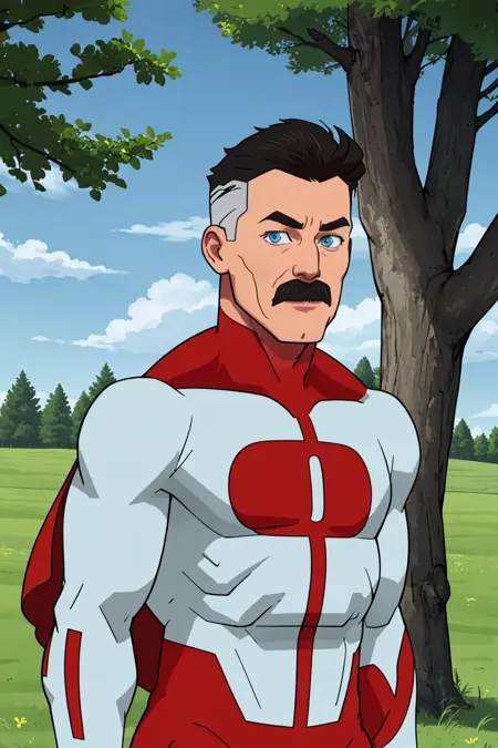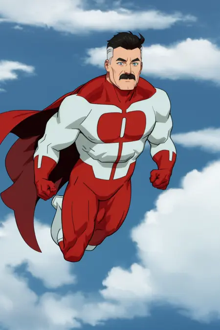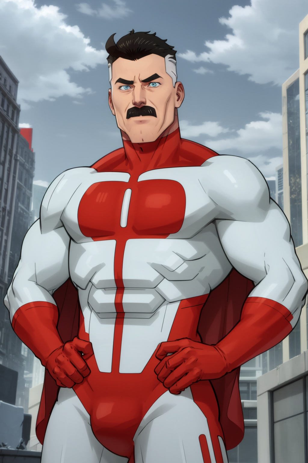 Other prompts : 1boy, black hair, two-tone hair, short hair, blue eyes, mustache, bodysuit, cape, muscular, thick eyebrows