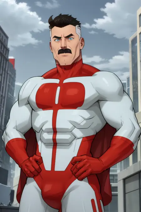 其他提示词:1boy, black hair, two-tone hair, short hair, blue eyes, mustache, bodysuit, cape, muscular, thick eyebrows