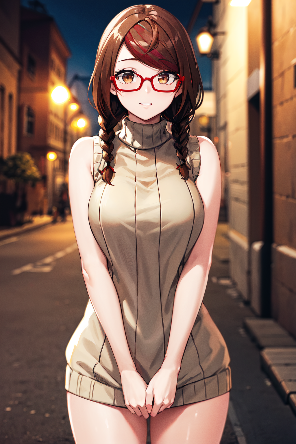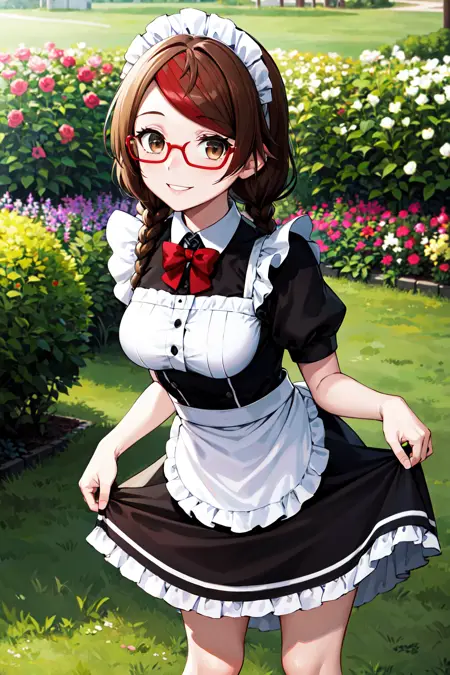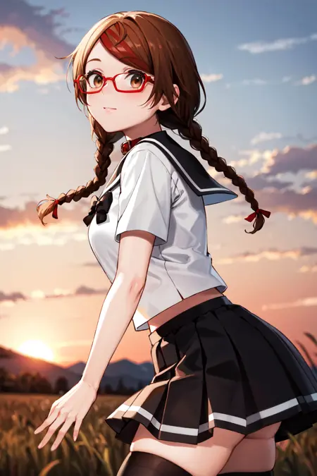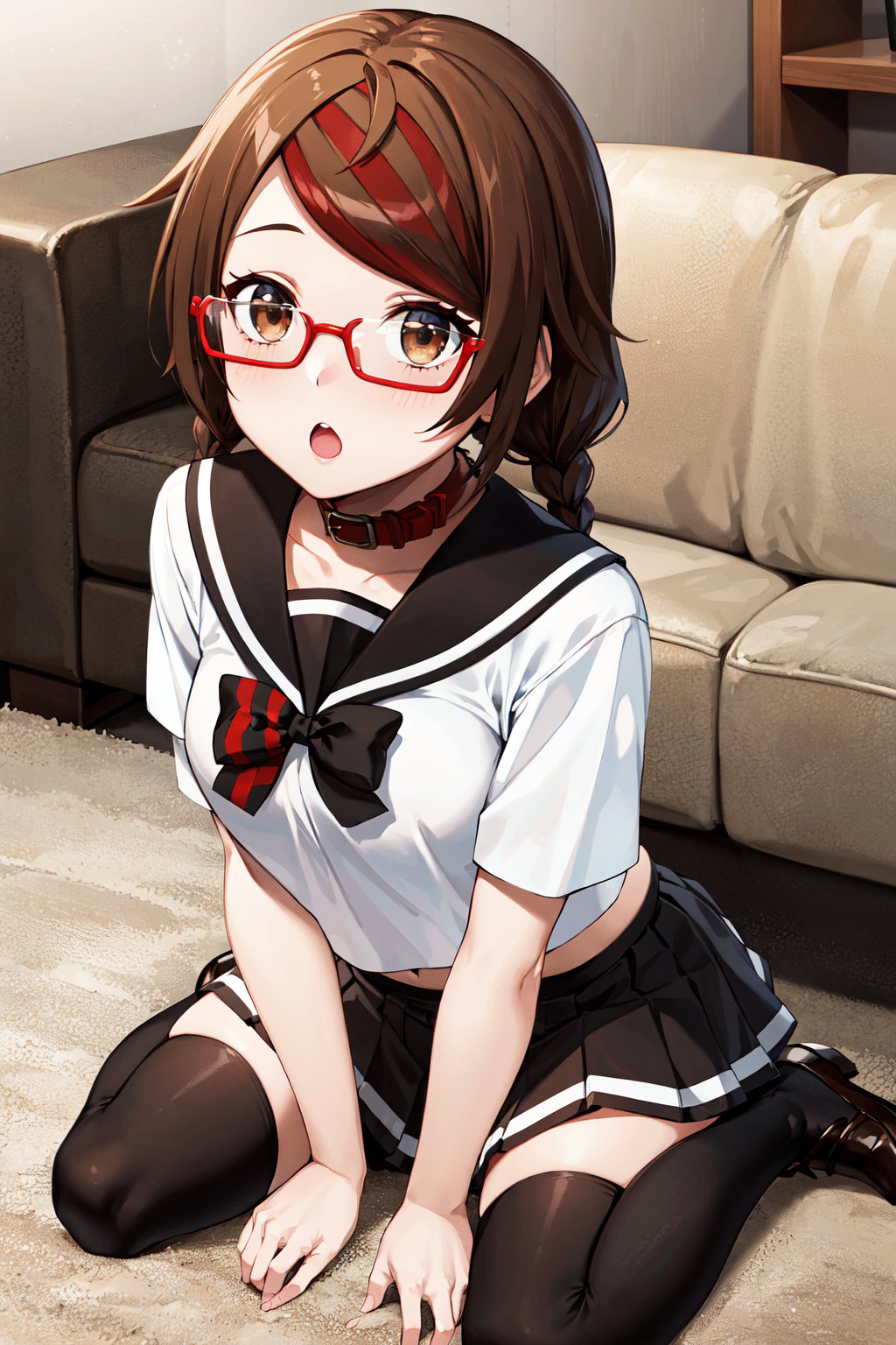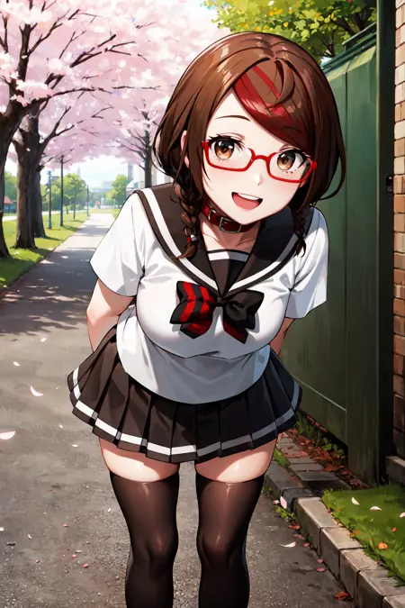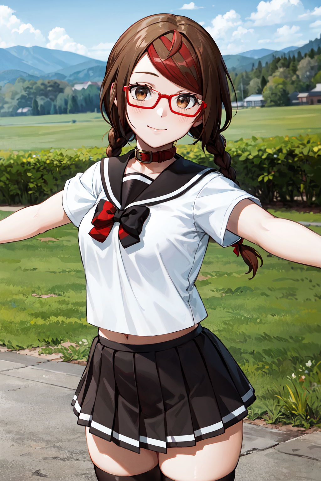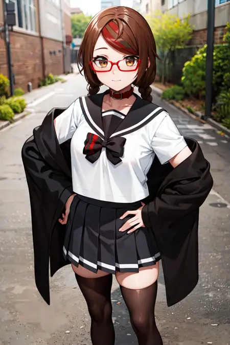 aamisaki, twin braids, multicolored hair, brown eyes, red-framed eyewear, red collar, serafuku, sailor collar, multicolored bow, sailor shirt, white shirt, short sleeves, pleated skirt, black skirt, black thighhighs
