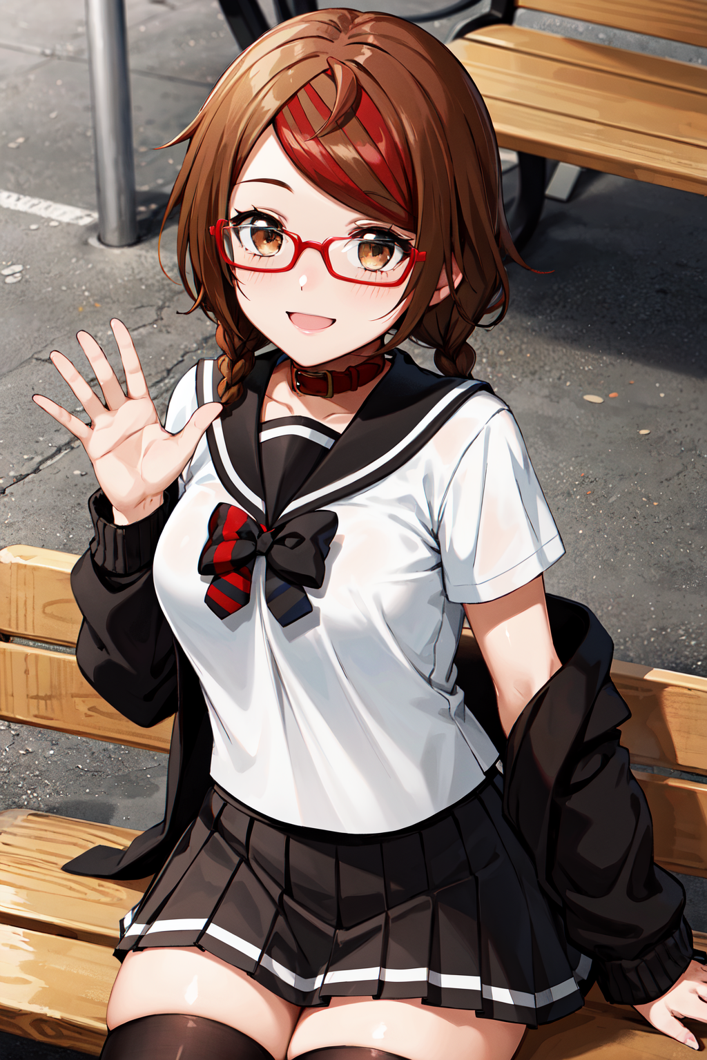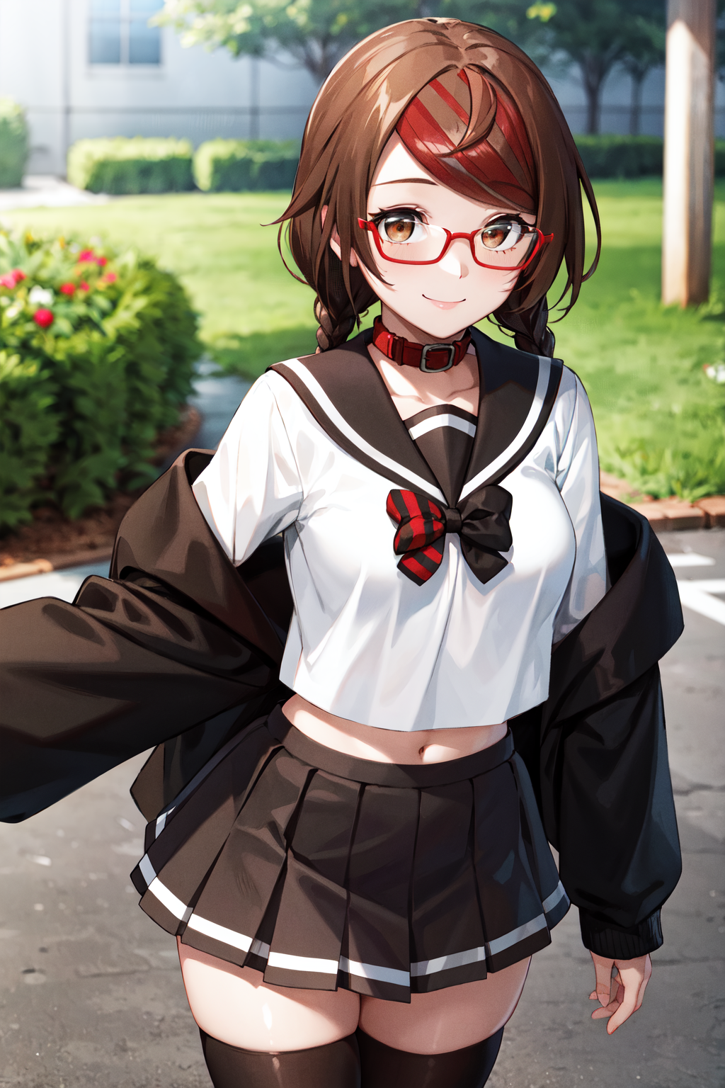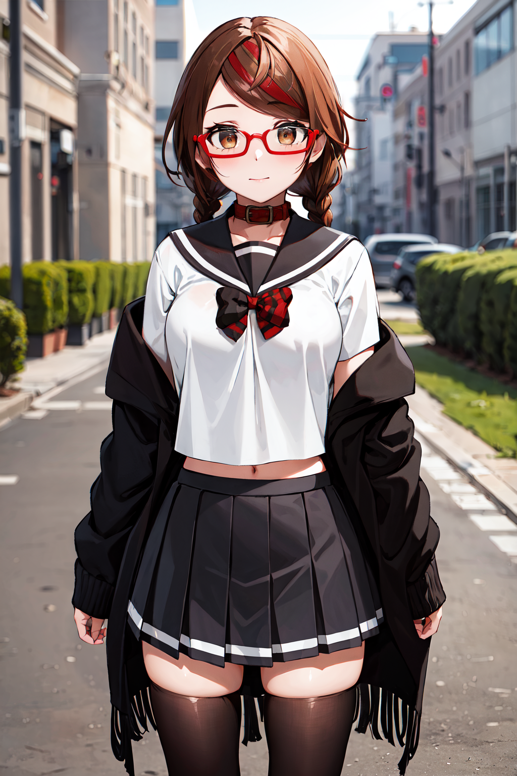 aamisaki, twin braids, multicolored hair, brown eyes, red-framed eyewear, red collar, serafuku, sailor collar, multicolored bow, sailor shirt, white shirt, (off shoulder:1.2), black jacket, pleated skirt, black skirt, black thighhighs