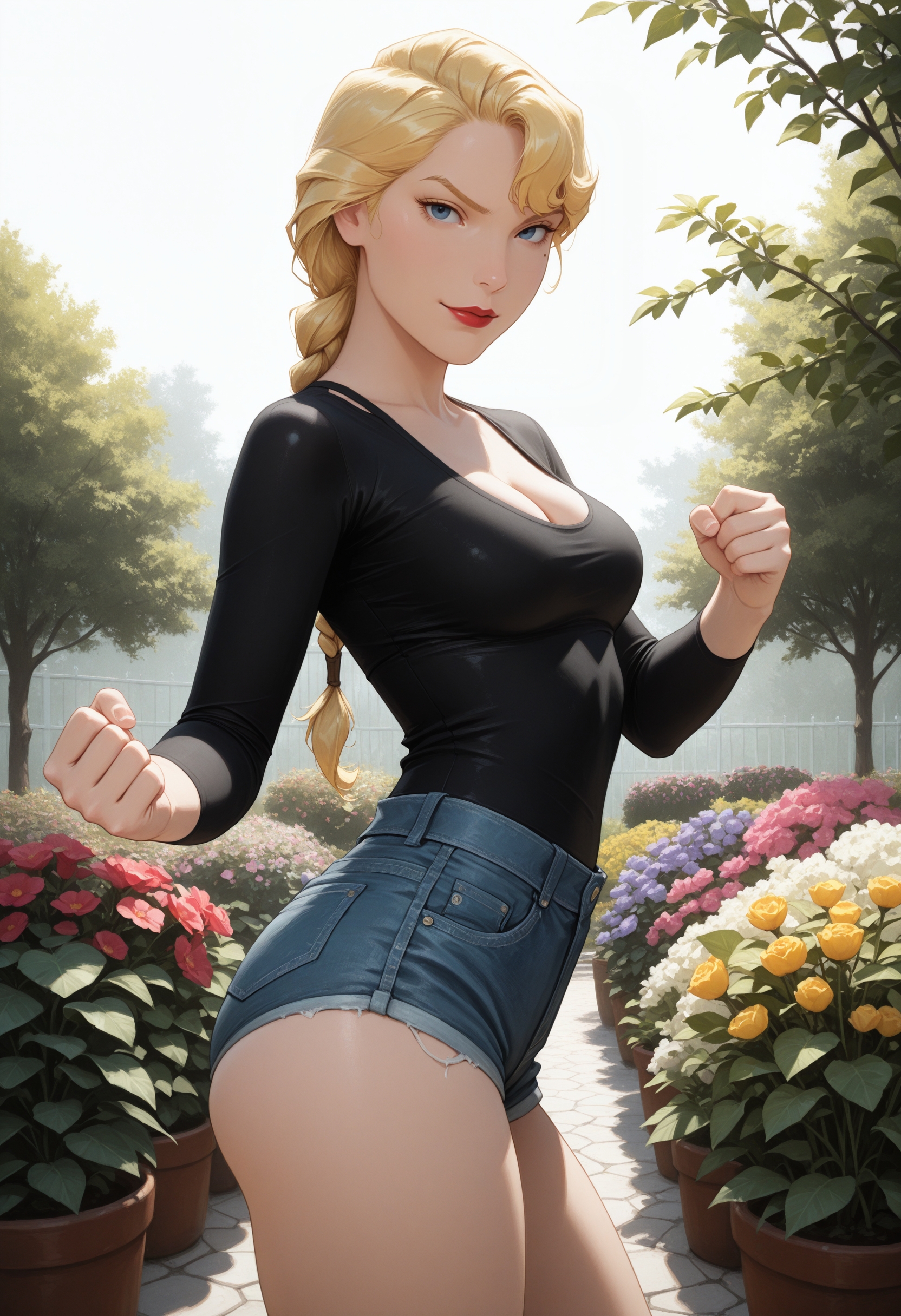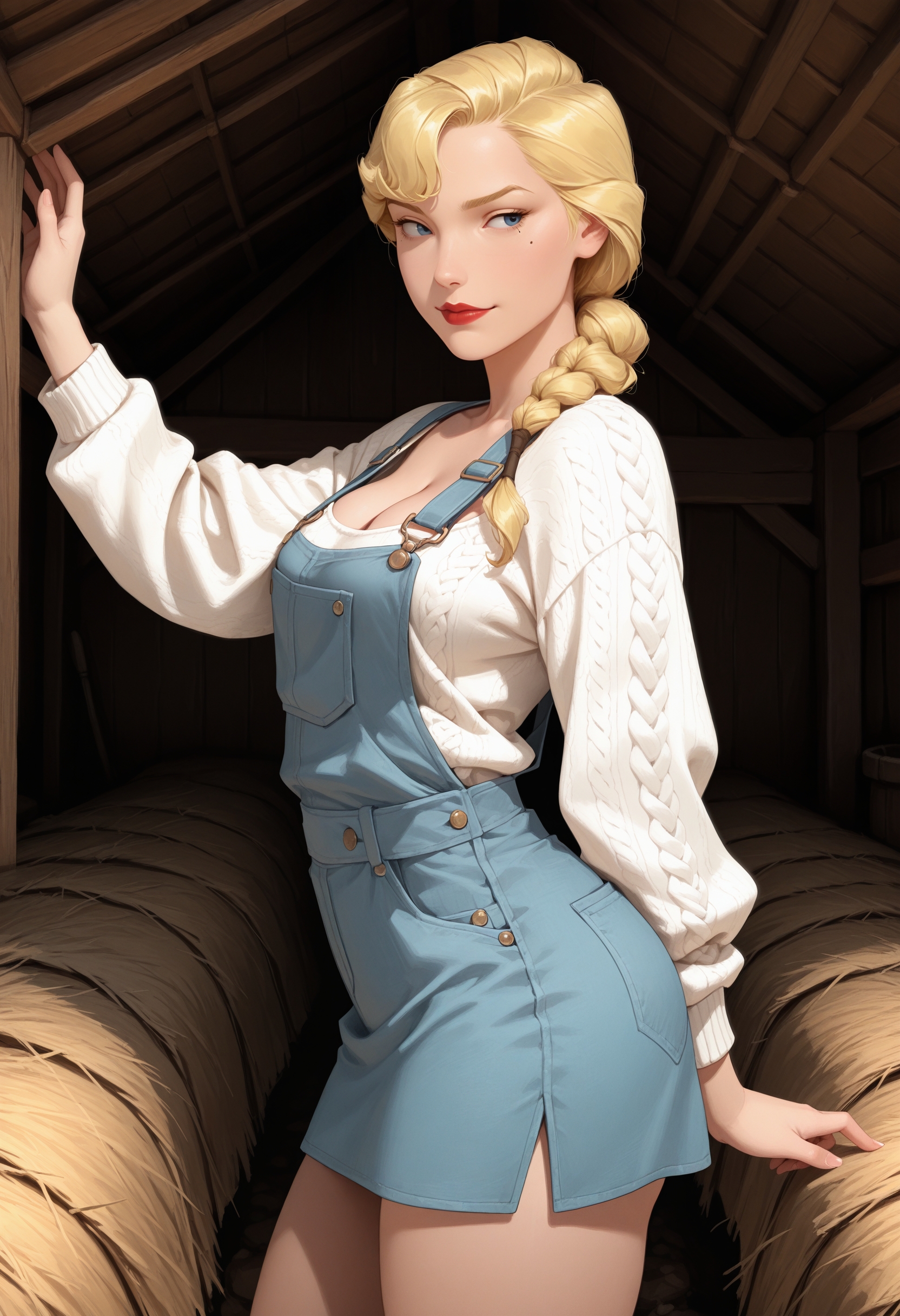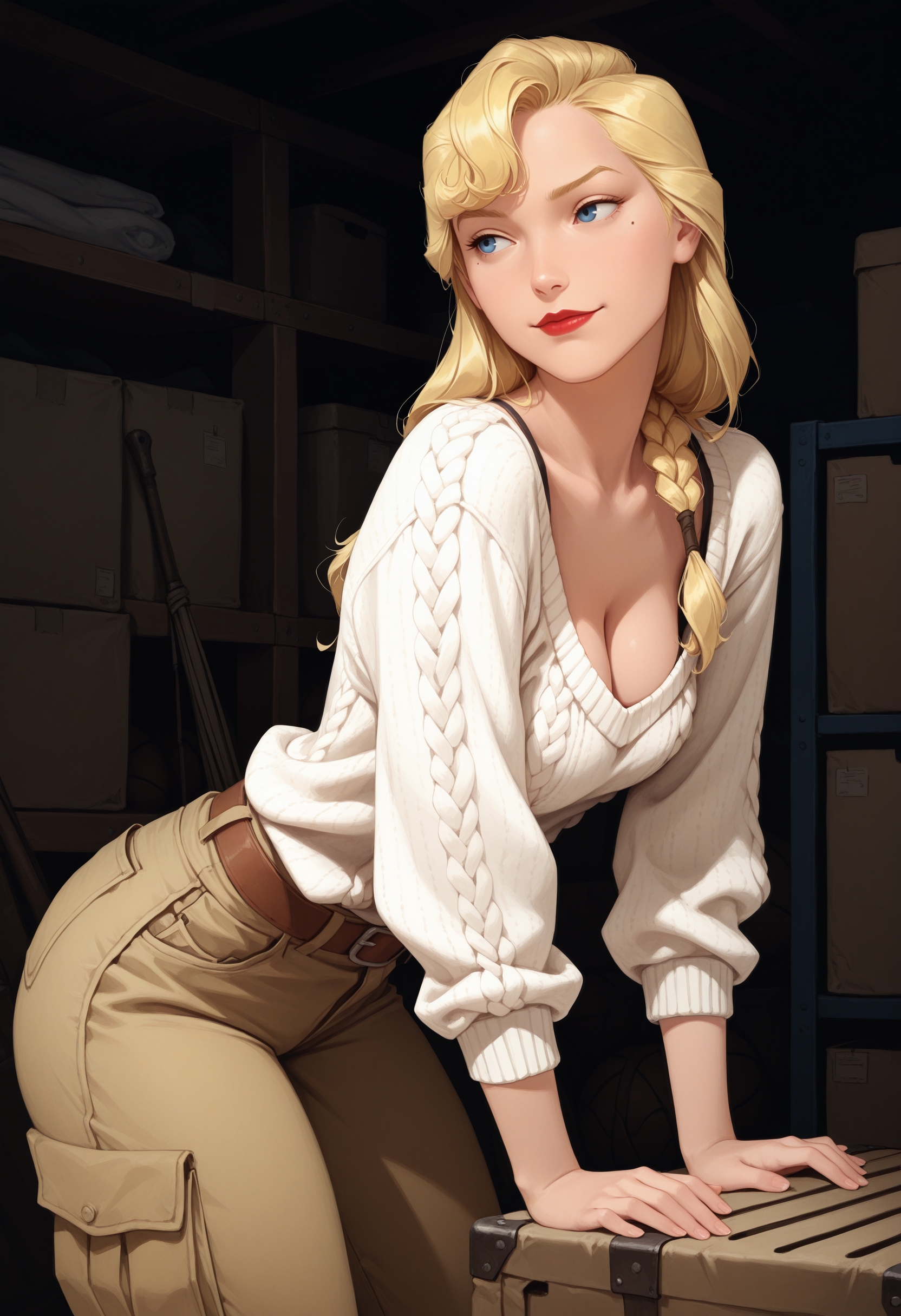 (肯定的プロンプト)helga sinclair, long hair, blonde hair, braid, arched bangs, blue eyes, mole under eye, red lips,