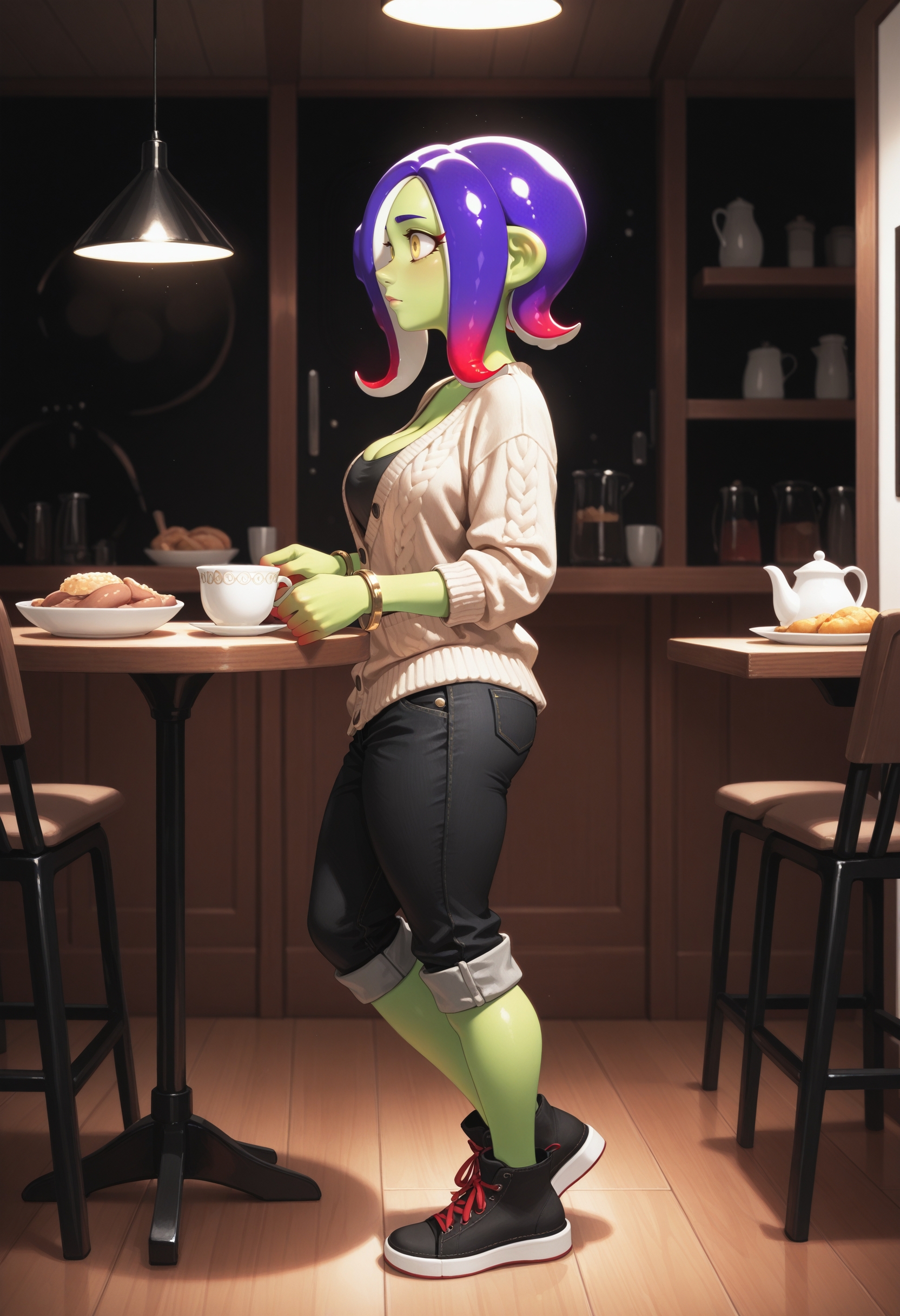 (正面提示词)acht, octoling, 黄色眼睛, 彩色皮肤, 绿色皮肤, 渐变发色, 紫色头发, 红色发梢, 触手状头发, 吸盘