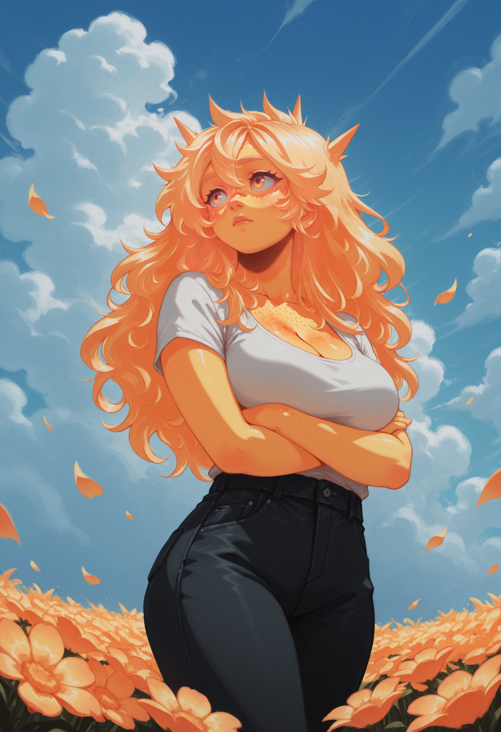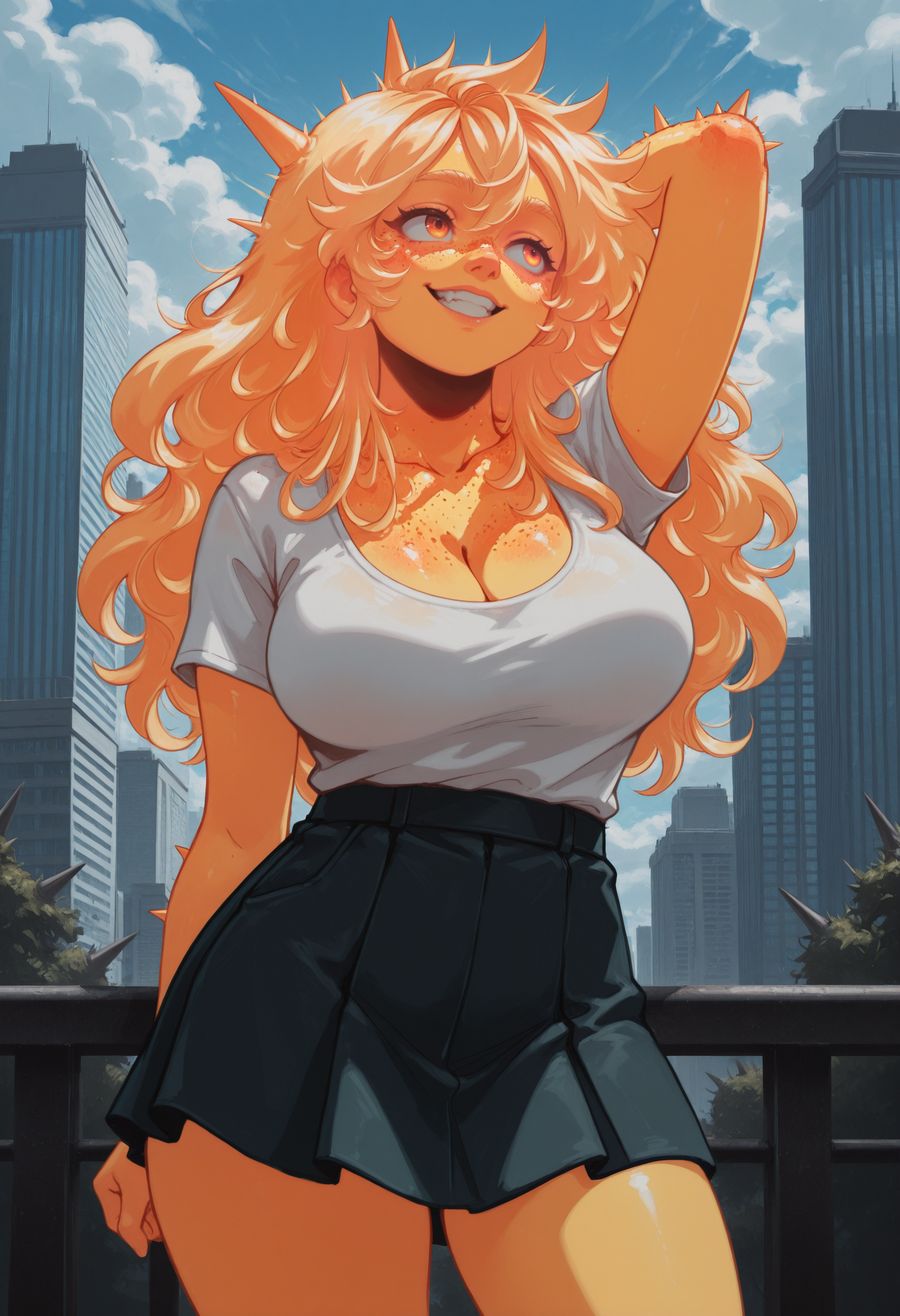 (肯定的プロンプト) lynsunchan, 擬人化, 色付きの肌, 黄色い肌, 光る肌, 体のほくろ, ほくろ, オレンジ色の目, 金髪, 長い髪, 大きな髪, とげとげした髪, 大きな胸,