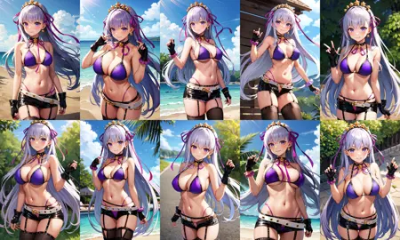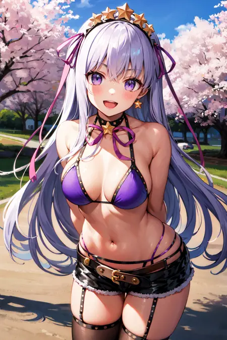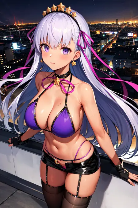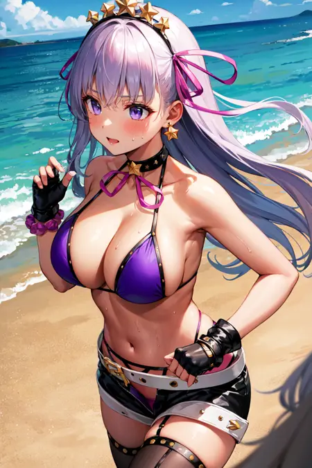服装1aabb, 长发, 头饰, 发带, 发带, 紫色丝带, 星星耳环, 深色皮肤, 晒黑, 项圈, 颈部丝带, 紫色比基尼, 手镯, 露指手套, 黑色手套, 白色腰带, 黑色短裤, 黑色过膝袜
