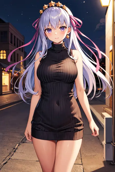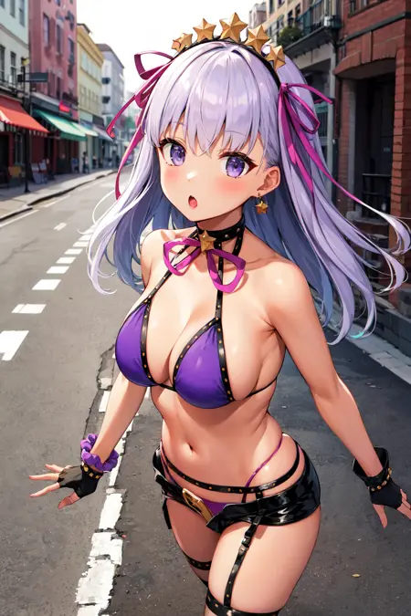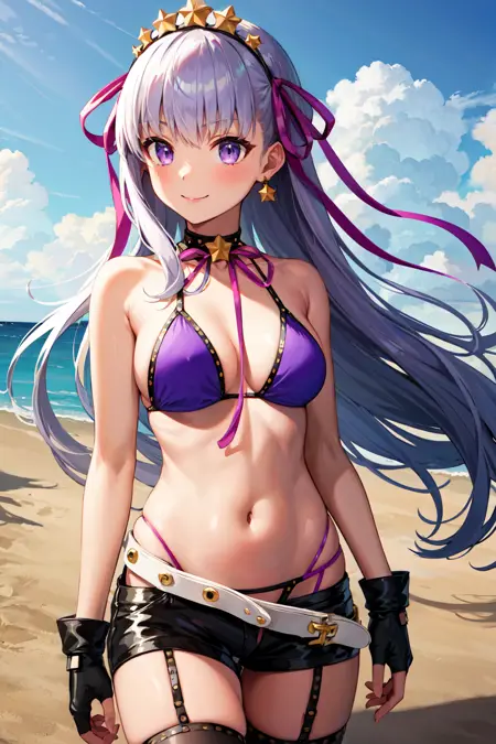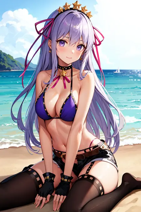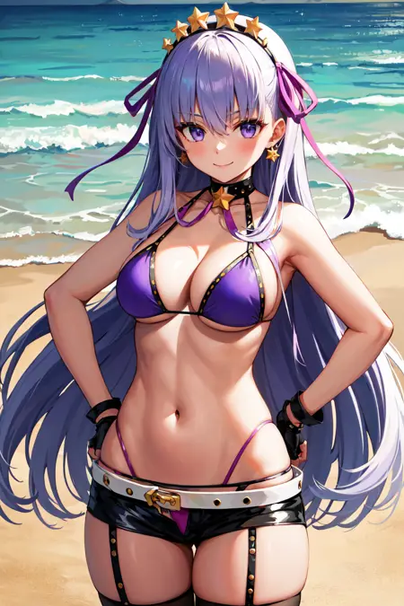 outfit1aabb, long hair, hair ornament, hairband, hair ribbon, purple ribbon, star earrings, dark skin, tan, choker, neck ribbon, purple bikini, bracelet, fingerless gloves, black gloves, white belt, black shorts, black thighhighs