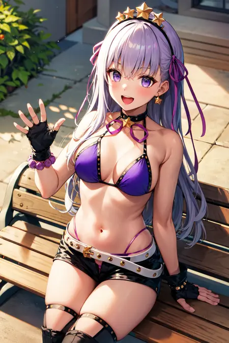 衣装1aabb, 長い髪, 髪飾り, ヘアバンド, 髪リボン, 紫のリボン, 星型のピアス, 濃い肌, タン, チョーカー, 首リボン, 紫のビキニ, ブレスレット, 指なし手袋, 黒い手袋, 白いベルト, 黒いショートパンツ, 黒いハイソックス