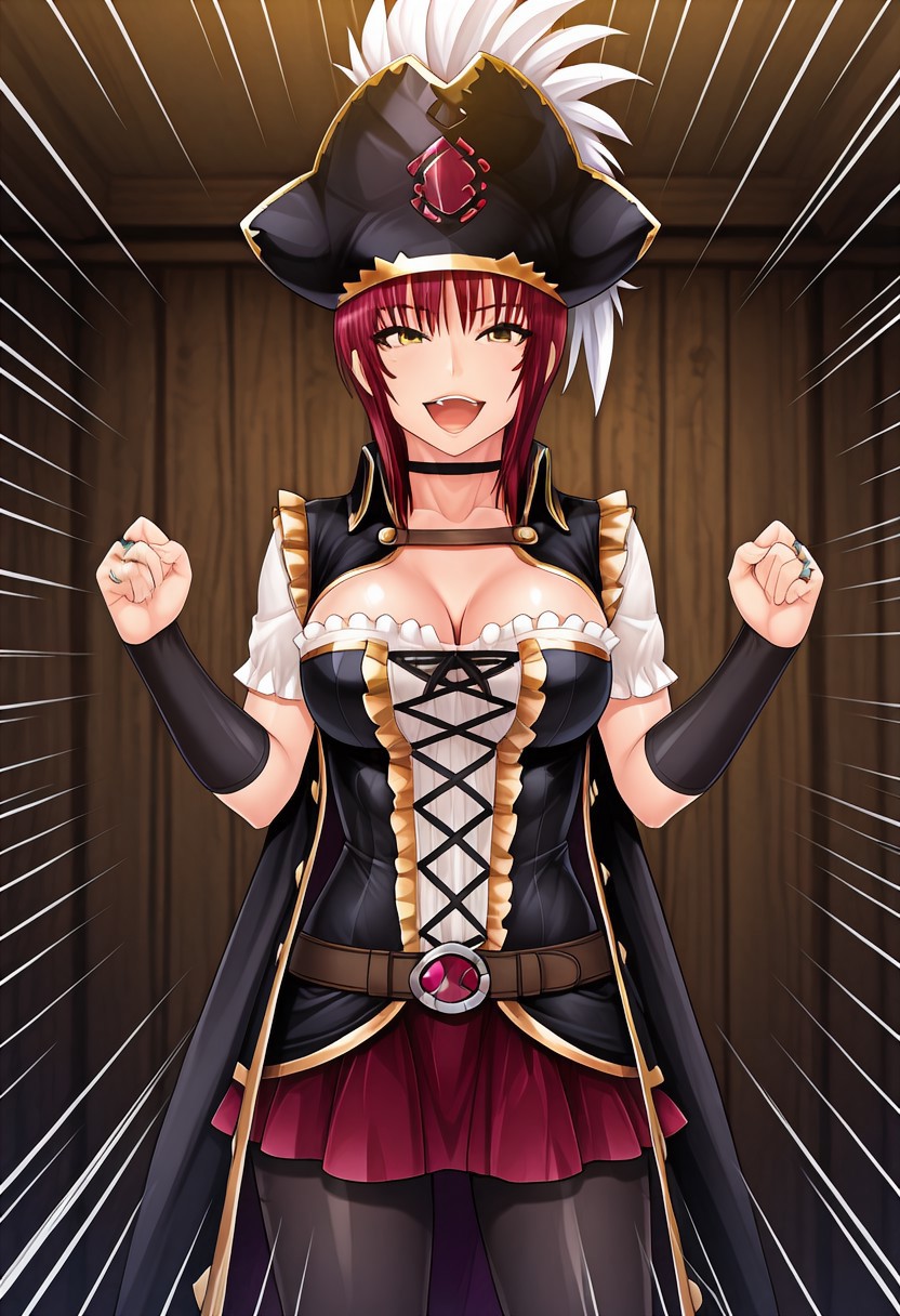 ルビー海賊団、赤髪、ショートヘア、黄色い目、中程度の胸、海賊、海賊帽、赤いスカート、タイツ、コルセット、帽子の羽、クロスラッセ服、チョーカー、胸元、ジュエリー、マント、ミニスカート、ベルト、ブライダルグローブ、
