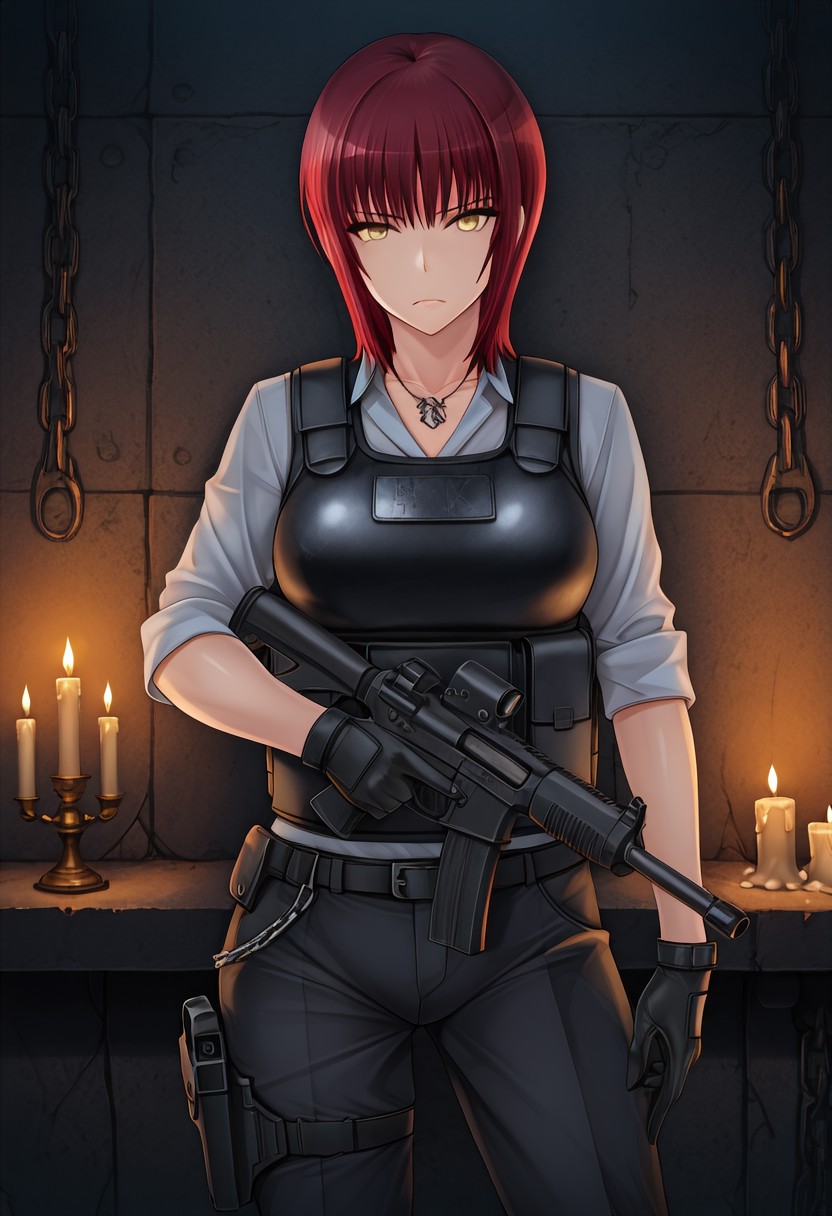 ホルスター、黒手袋、ネックレス、防弾チョッキ、ズボン、銃、