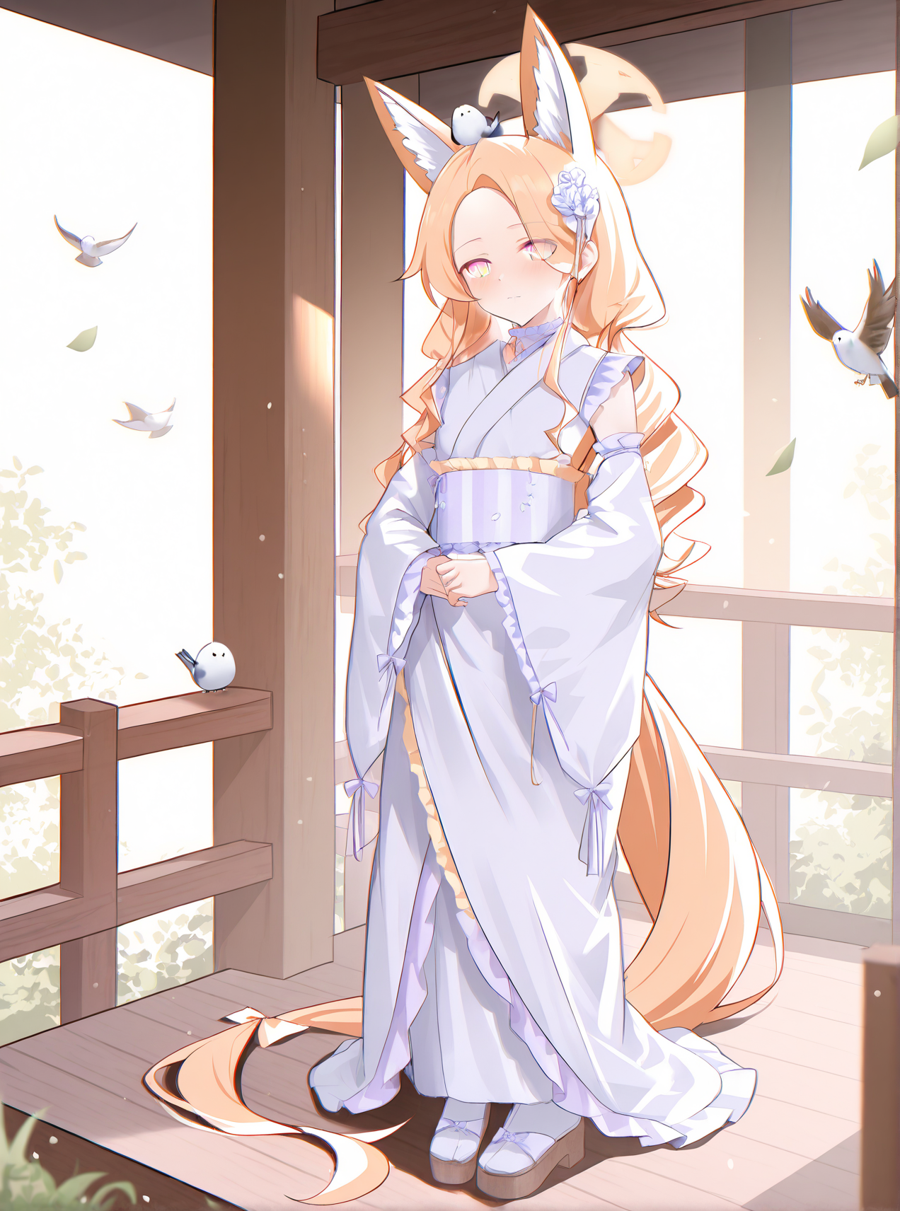 설날: seia-year, seia-halo, 노란 머리카락, 동물 귀, 일본 복장, 다색 눈, 긴 머리카락, 흰 키모노, 동물 귀 털, 닫힌 입, 넓은 소매, 분리된 소매, 새, 시청자 바라보기, 띠, 레이스 장식, 오비, 추가 귀, 머리 꽃, 긴 소매, 이마, 대체 복장, 갈라진 앞머리, 다이아몬드 머리 꽃, 주름, 머리 위의 새, 꼬리, 꽃, 게타,
