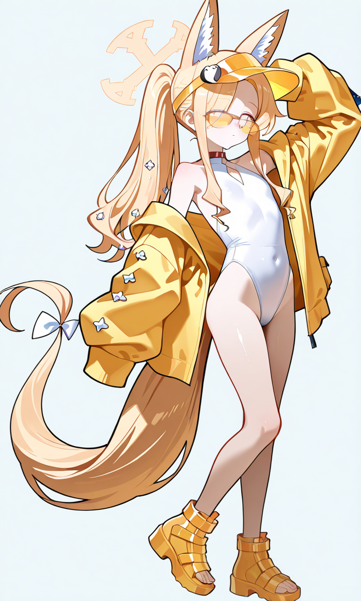 수영복: seia-swim, seia-halo, 동물 귀, 블론드 머리, 다색 눈, 노란 셔츠, 노란 머리 장식, 동물 귀 털, 매우 긴 머리카락, 노란 햇빛 캡, 어깨 노출, 꼬리, 평평한 가슴, 벌어진 옷, 옆머리, 이마, 한쪽 눈 위의 머리카락, 갈라진 앞머리, 손가락을 넘어가는 소매, 하늘, 폰테일, 투명, 발가락 없는 신발, 샌들, 부츠, 노란 신발, 벌어진 재킷, 넓은 소매, 다리 노출, 선글라스, 흰색 하이레그 원피스 수영복, 리본 없음,
