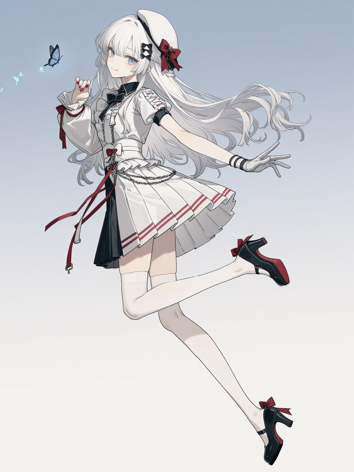 Hikari:hikari (브레이크스루), 흰 머리, 긴 머리, 앞머리, 모자, 베레모, 흰 머리 장신구, 모자 리본, bow, 빨간 bow, 검은 bow, 파란 눈, 한쪽 팔 노출, 한쪽 소매, 긴 소매, 풍성한 소매, 한쪽 장갑, 흰 장갑, 빨간 네일, 네일 폴리시, 드레스, 흰 드레스, 치마, 주름치마, 주름 드레스, 허벅지 긴 양말, 흰 허벅지 긴 양말, 검은 신발, 하이힐, 메리제인, 체인,